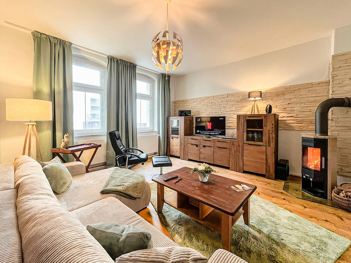 Boligen ligger i Halle/Saale, 4 km fra sentrum. Nyinnredet ferieleilighet (2 etasjer), med stor balkong. Den har 3 soverom, 1 stue med peis, et fullt utstyrt kjøkken, bad med dusj og badekar. Tre rom har TV, gratis Wi-Fi er tilgjengelig. Netflix Stream. Buss og tog, shopping og 1 restaurant ligger innen gangavstand. Vi gleder oss til å se deg.