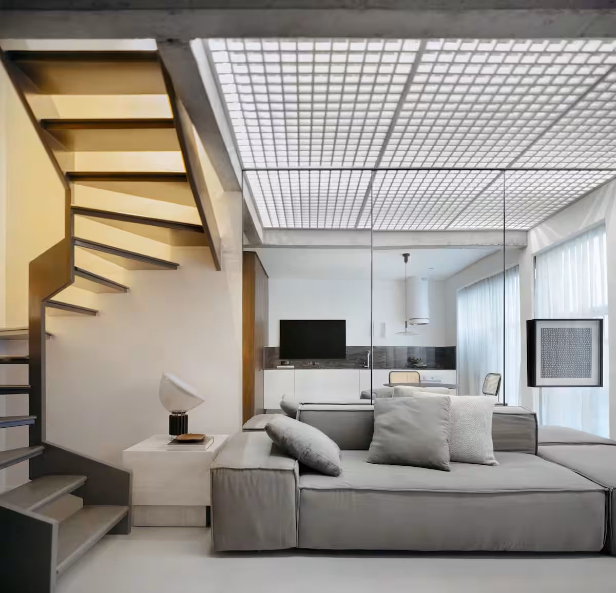 Øverst i Copan, vendt mot Avenida Ipiranga, inviterer denne 44 m² studioen oss til å sveve over landskapet i São Paulo. Følelsen av letthet kommer fra gulvflisene, som etter oppussingen strekker seg gjennom hele interiøret i leiligheten, og skaper visuell kontinuitet og integrasjon med den karakteristiske brisen fra den nordlige fasaden.