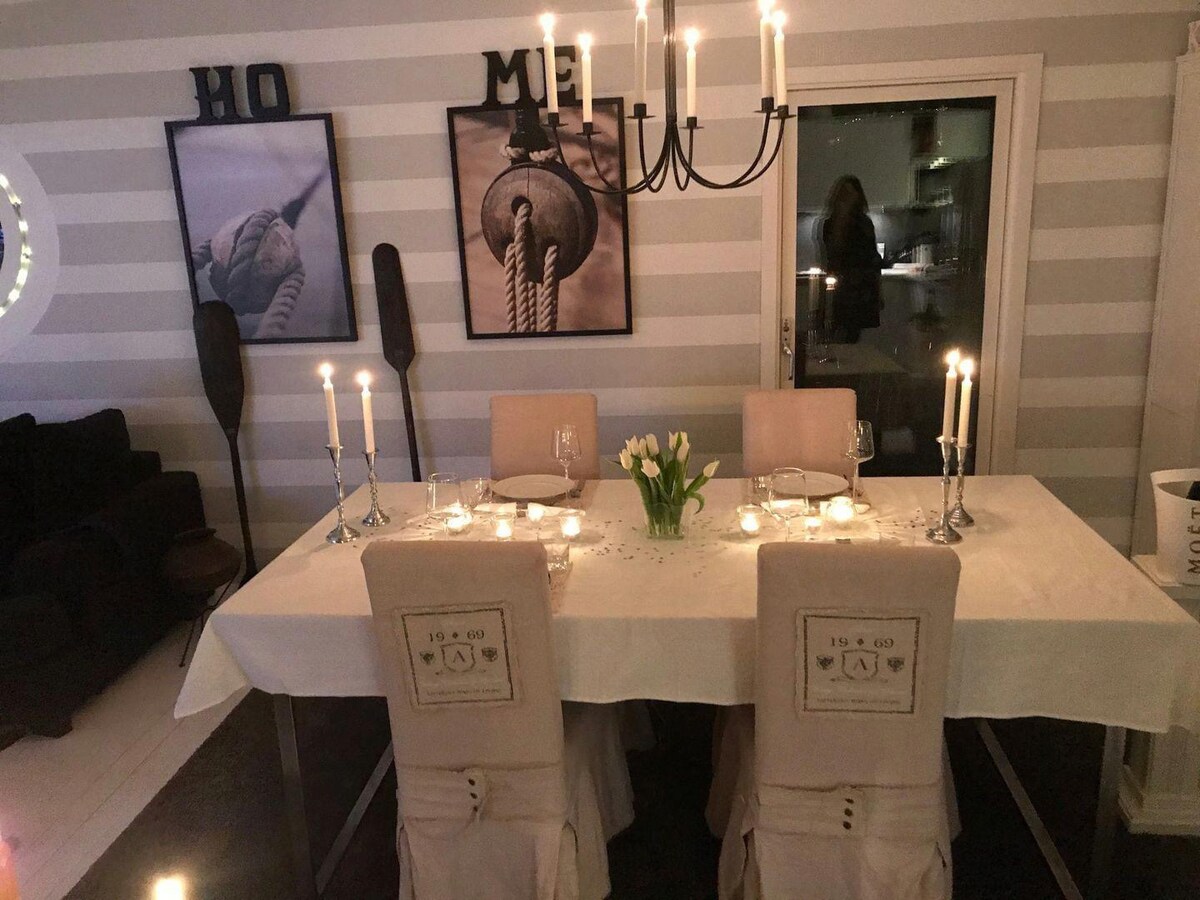Elegant og luksuriøs nybygget villa! Innredet med alle moderne bekvemmeligheter Du bor i et vakkert naturområde med turstier og fugletitting rett rundt hjørnet – Gode veiforbindelser (gratis parkering) – Buss i nærheten – Fine sykkel-/gangstier To bad, hvorav ett er på suiten til hovedsoverommet. Badene er utstyrt med dusj, vask og toalett. Det store badet har dobbel dusj. - Wi-Fi – Vaskerom med vaskemaskin/tørketrommel/tørkeskap – 75" TV – Musikanlegg – terrasse med utemøbler