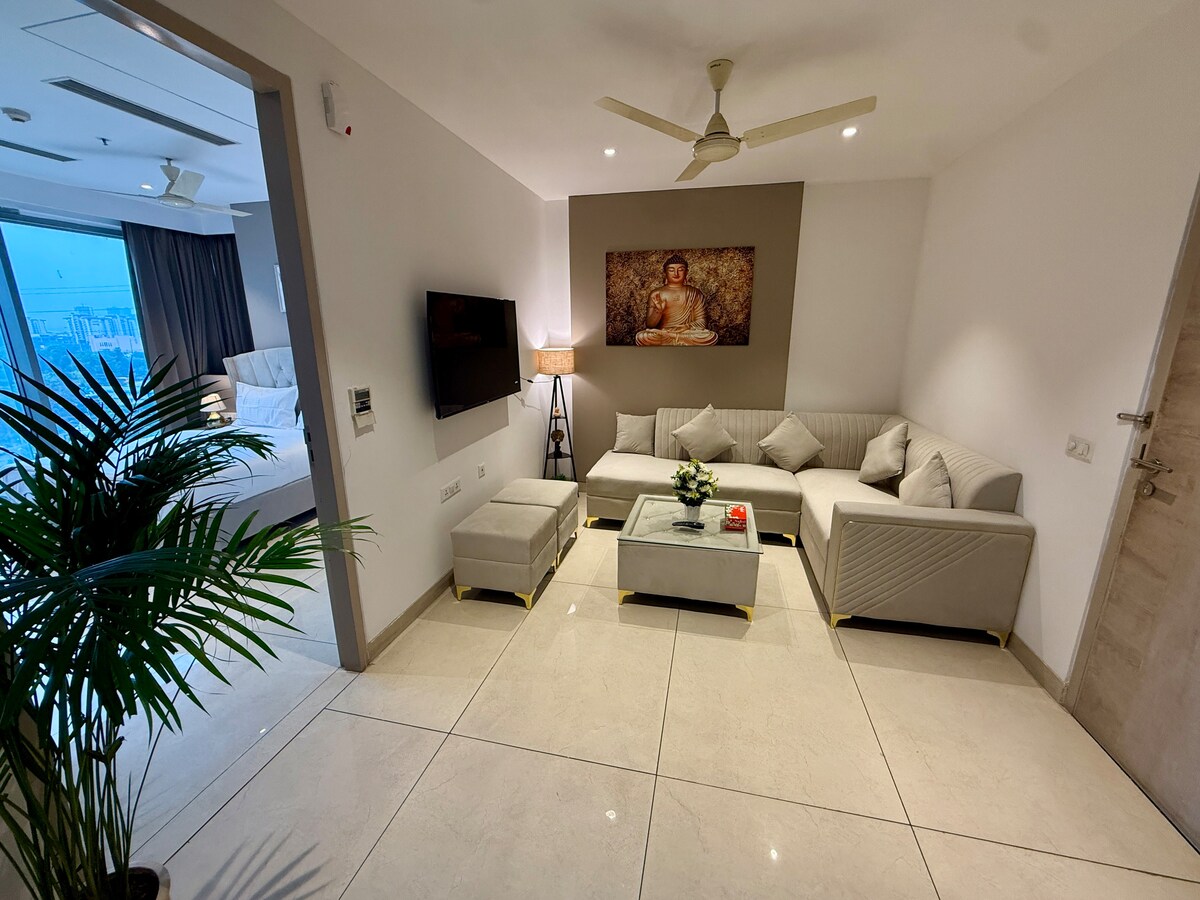 • H13/HEPA-romluftrensere • Daglig rengjøring og rene håndklær. • Vaktmester fra kl. 10.30–19.00. • Smart-TV m/ Netflix, Amazon Prime osv. • trådløst nettverk med høy hastighet. • 5–7 minutter fra Mehrauli Fashion Street (beste natteliv i Delhi) og Saket Citywalk Mall • 5 min fra Delhi Metro Velkommen til onnyxrooftop. Jeg har organisert en luksusopplevelse i Sør-Delhi, sentrale NCR. Nyt en fantastisk tid med luksuriøse soverom, utsøkt stue og privat pergola-lounge på taket med boblebad og bar.