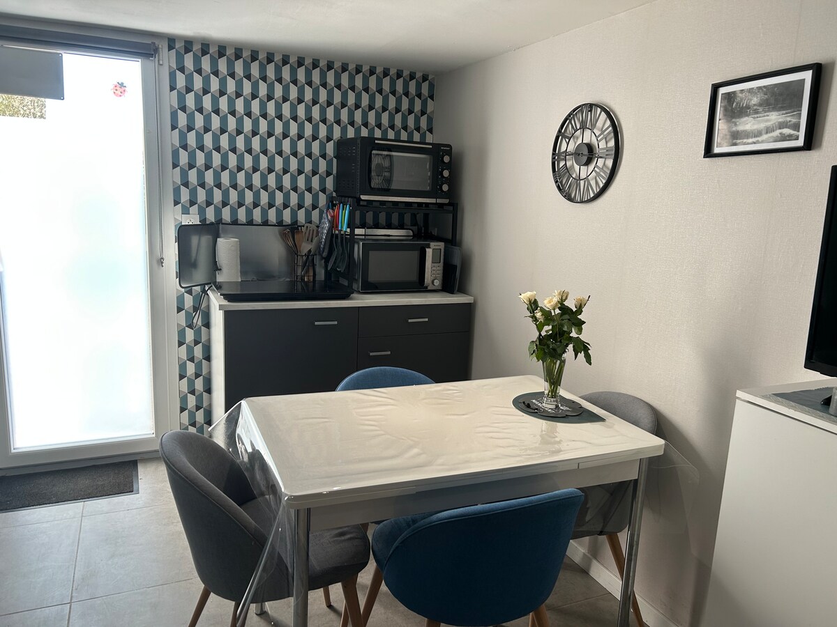 Boligen er 35 m2, helt ny i en industribygning bygget på 1950-tallet, 12 km fra Puy du Fou i La Flocellière. Studioet ligger i huset vårt med uavhengig tilgang og felles korridor. Det er et rolig og stille sted i Vendées skogsområde. Du har all nødvendig komfort for å lage mat med komforten av en TV, wifi og et myggnett på vinduet.