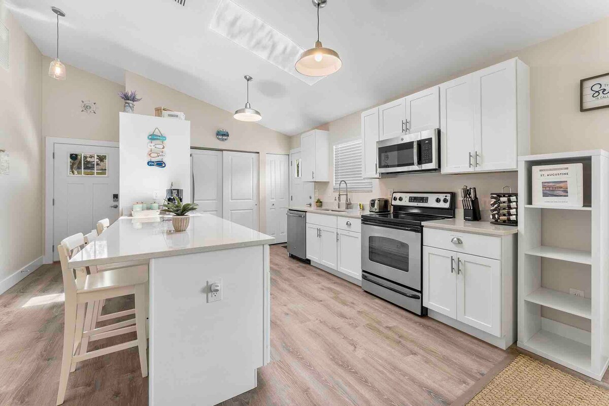 Nyoppusset og vakkert dekorert!! Strandhuset vårt med tre soverom og to bad har alt du trenger for drømmeferien din på stranden! Vakkert uteplassområde med to utendørsbord og plasser for å slappe av etter en dag på stranden! Perfekt beliggenhet – stranden ligger omtrent en engelsk mil unna, og shopping (dagligvarer, restauranter osv.) ligger mindre enn en halv engelsk mil unna! St. Augustine sentrum ligger ca. 7 miles unna. Opptil åtte sengeplasser. Fullt utstyrt kjøkken! Trådløst nettverk i hele huset. Parkering i oppkjørselen.