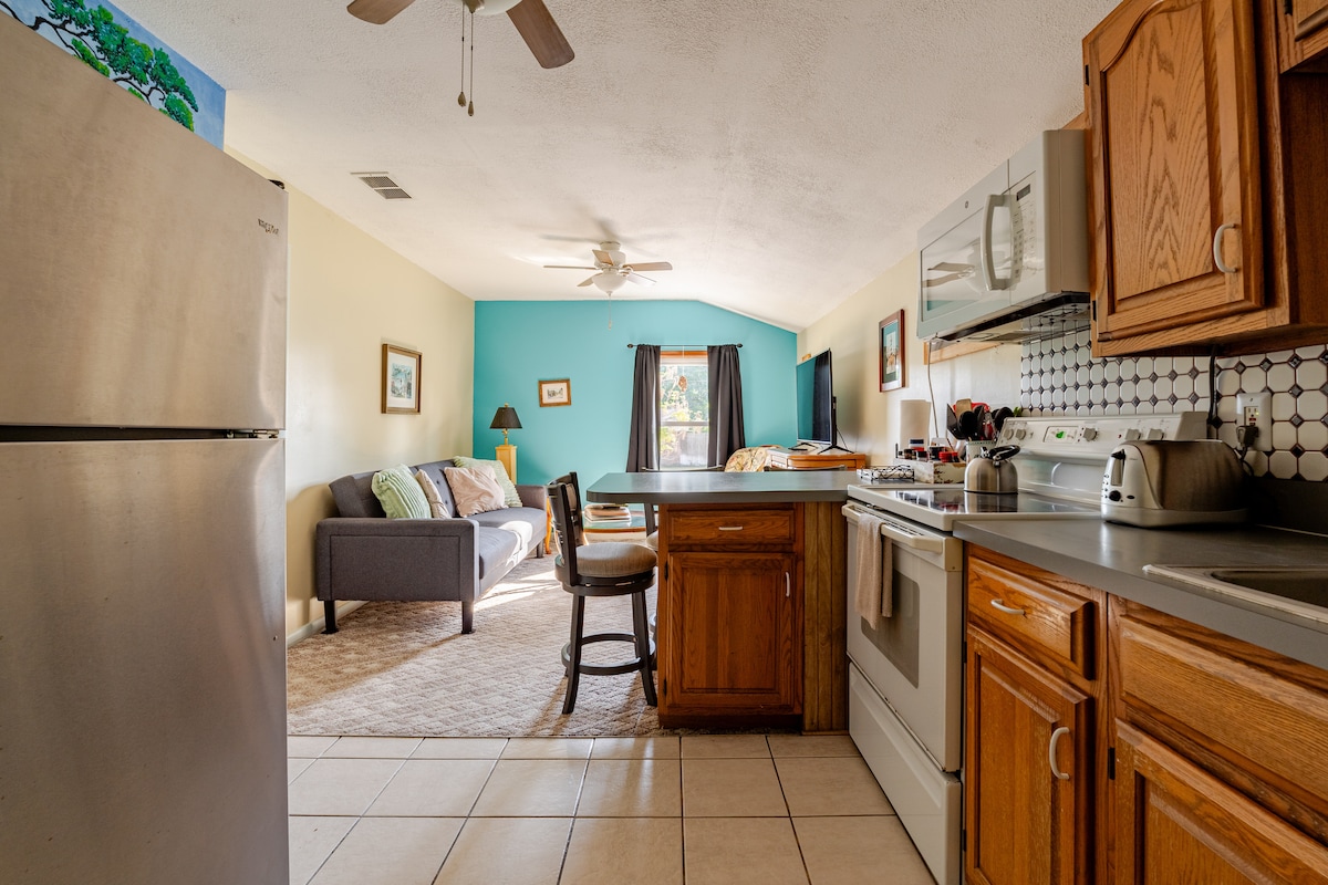 Serene Studio er nettopp det – et rolig, fredelig, privat sted å legge hodet etter å ha utforsket St. Augustine. Vår 500 kvadratmeter store studiohytte er atskilt fra hovedhuset, hvor vi bor. Den ligger i et boligområde som går langs Intracoastal Waterway (som gir nydelige morgen- eller kveldsturer). Vi er ti minutter med bil (uten trafikk!!) til den historiske sentrum eller St. Augustine Beach. Serene Studio er det beste fra to verdener uten støy, kjas og mas!