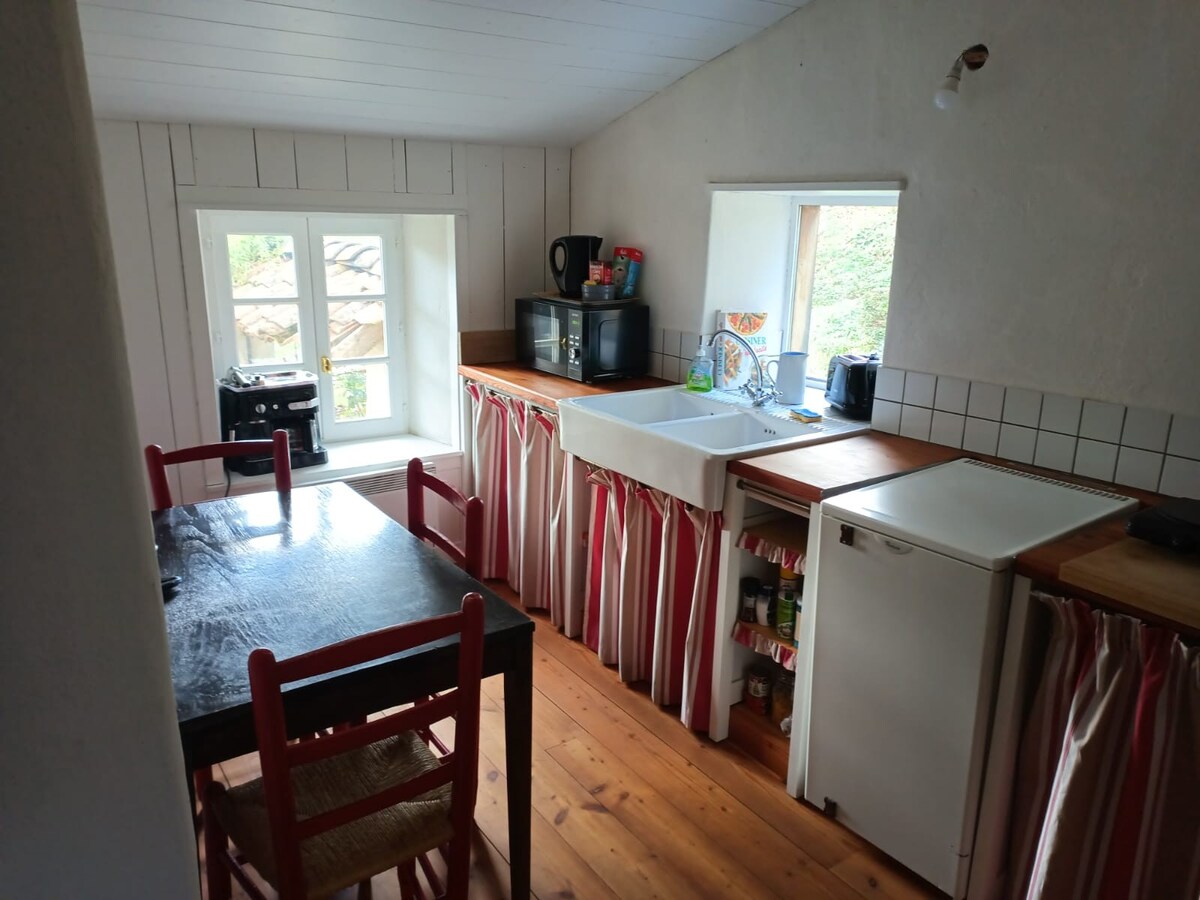 Stille i denne renoverte, gamle gårdshuset med tradisjonell og varm dekorasjon Oppholdet blir komfortabelt, rustikt og landlig. Du vil dra full nytte av den romslige, forhøyede terrassen med utsikt over dagrommet. Eierne vil gi deg mange utendørsspill Hytte i andre etasje, Adskilt tilgang. Stort dagrom, stue, spiseområde, innebygd kjøkken. Vaskerom. 2 toaletter. 3 soverom . Privat område på bad, delte barneleker.
