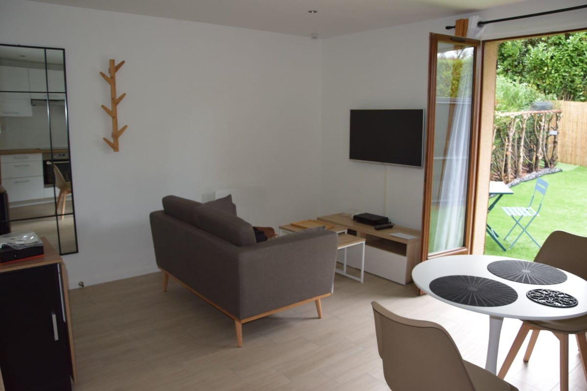 Hyggelig T2-leilighet, koselig, privat parkeringsplass, ideell for par eller enslige. Renovert, lys bolig med en 50 m² sørvendt hage med møbler og markise. Utstyrt med et soverom med bad, et åpent kjøkken og oppvaskmaskin; en stue utstyrt med TV (Netflix) og kontorområde med fiber-wifi; separat toalett. Handel og olympiske steder i nærheten. 5 minutter fra Fontenay-le-Fleury stasjon (= 10 minutter fra Versailles og 25 minutter fra Paris Montparnasse)
