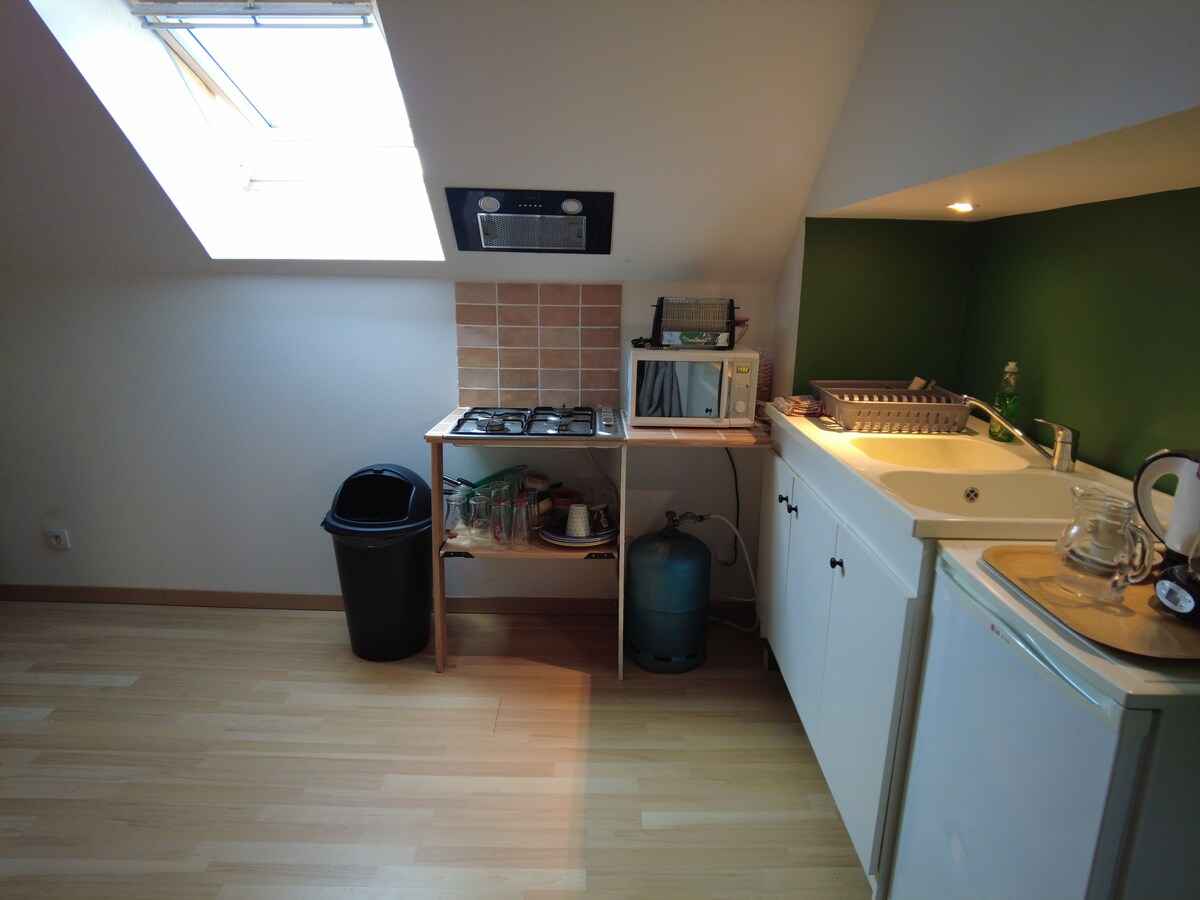 Enestående omgivelser for denne studiohytta som er renovert i økologiske materialer. Veldig godt designet for å ta imot to personer (fire personer for et kort opphold). En dobbeltseng er plassert på mesaninen, en stige gir tilgang. En 2d-seng er tilgjengelig i første etasje (i tilfelle tre eller fire gjester). Utstyrt kjøkken: kjøleskap, komfyr, vannkoker. Bad med dusj og toalett. Internettforbindelse. En utendørs trapp gir tilgang til gite. Utendørs hageterrasse til disposisjon.