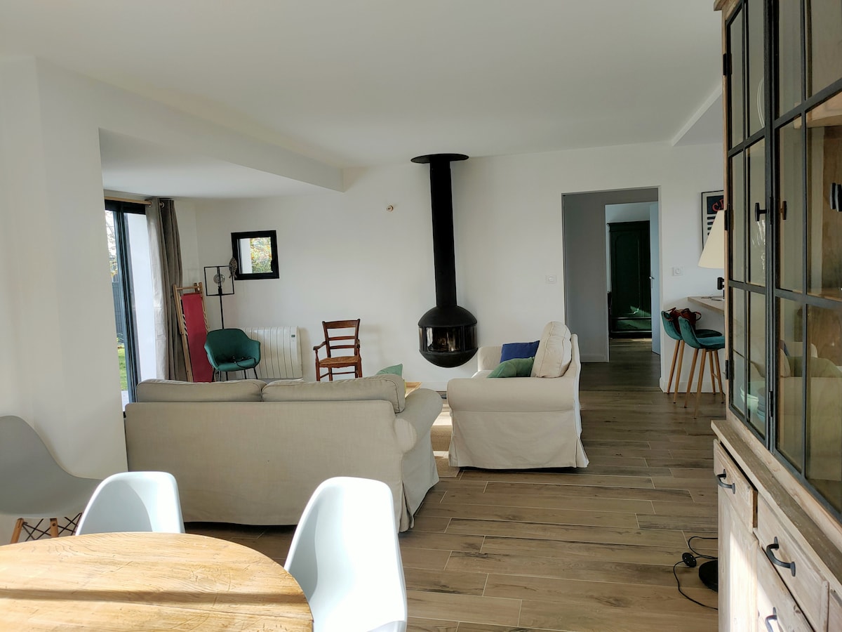 Maison d'architecte, 6 pièces, 120M², 4 ch, 8 couchages, jardin clos 700m² sans vis à vis, plein soleil, plage à 5mn à pied et centre bourg à 15 mn à pied. RDC : grand séjour avec terrasse, cuisine américaine. Ch lit 140 avec salle d'eau et WC, accès jardin. 1 WC indépendant. Etage : 1 ch lit 140, 1 ch avec terrasse et lit 160, 1 ch avec 2 lits 90. Salle de bains. 1 WC indépendant. Garage fermé, 2 places parking devant la maison. En hiver, forfait bois pour cheminée 50e en plus