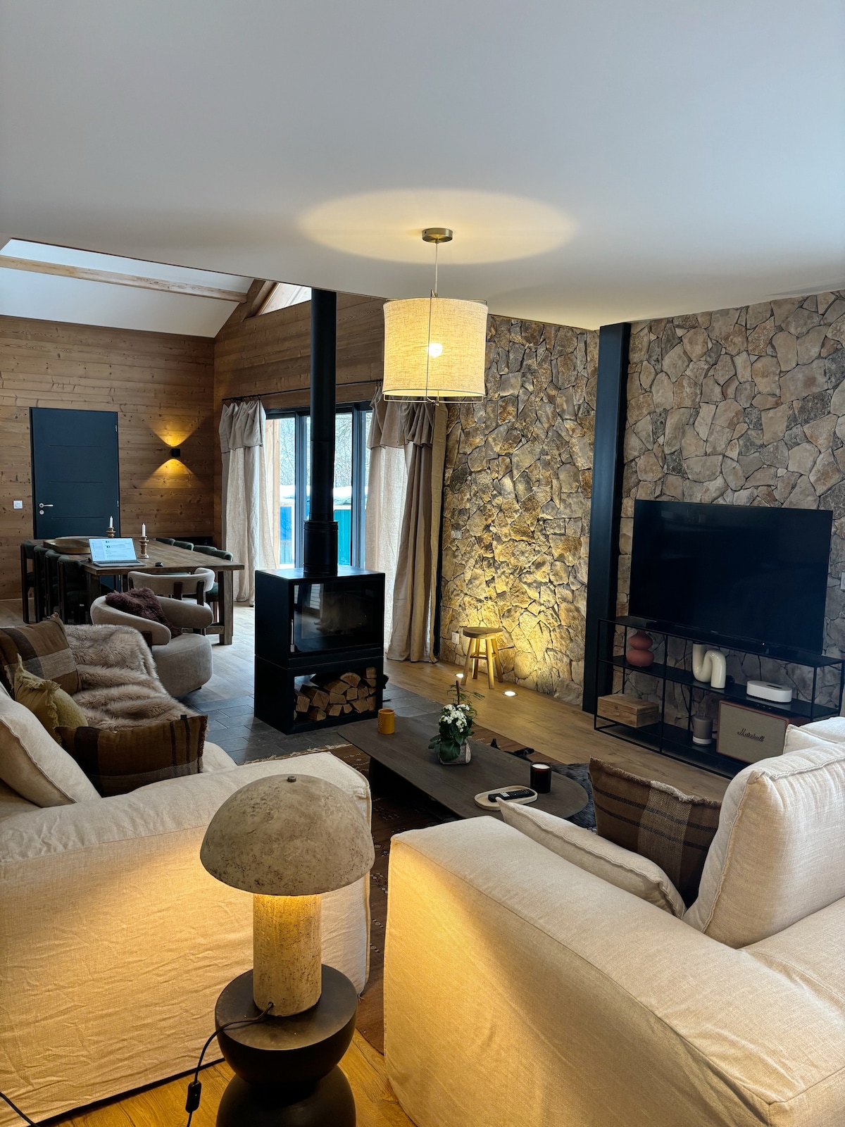 Hytta tilbyr panoramautsikt over toppene fra alle sider. I tillegg til stuen, hvor de store vinduene gir inntrykk av å bo i landskapet, har etasjen 3 soverom (2 lukkede) og et bad, alle med store åpninger for å multiplisere utsikten. Interiøret, en blanding av autentisk og moderne, adopterer hytte-stilen som en rød tråd, i samsvar med det dominerende treverket, som er naturlig. Valget av farger og materialer sikrer en koselig atmosfære.