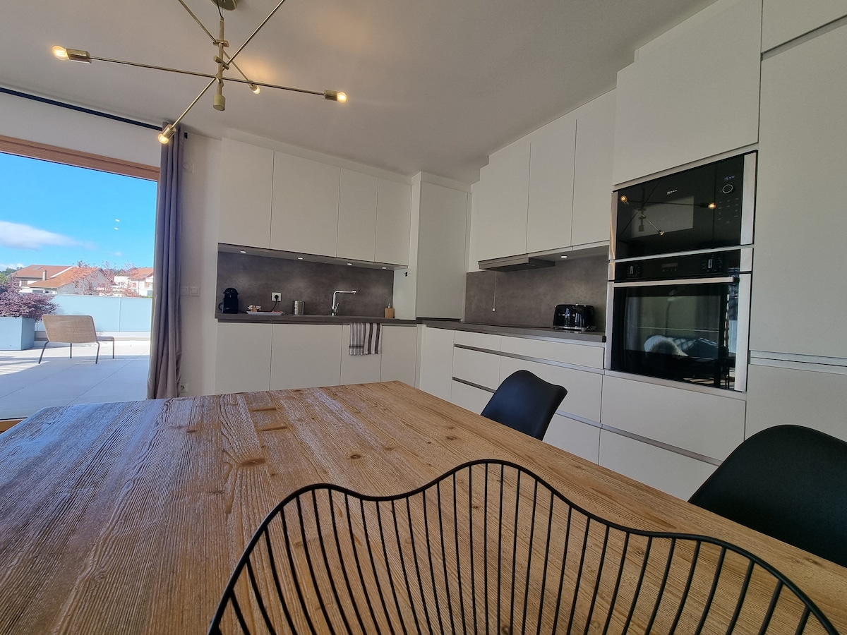 Eksepsjonell leilighet med panoramautsikt over Genèvesjøen og de omkringliggende fjellene. Uten vis-à-vis, vil den forføre deg med grønne områder og ro rundt. Leiligheten ligger i et boligområde på høydene av Thonon-les-Bains med utsikt over sentrum. Den er ideell for sommer- og vinterferier med nærhet til skibakkene i nærheten, samt tilgang til innsjøen. (2 terrengsykler, 1 kano, 1 padle tilgjengelig, TV med Netflix-tilgang)