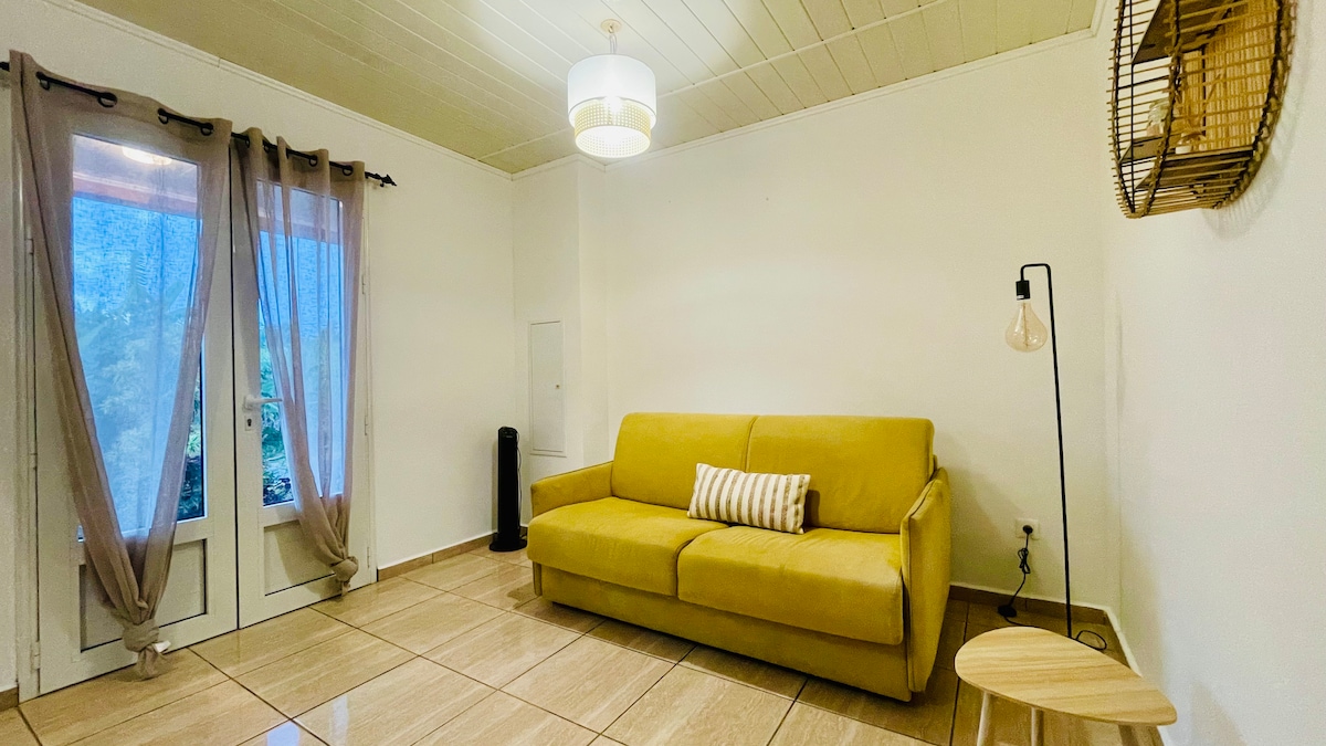 Studio TB stående 22 m² møblert, klimaanlegg, utstyrt++ + IDEELT for 1 til 2 personer + 12 m² terrasse under utendørs stue/spisebord/grill/privat hage vedlikeholdt på 30 m²/privat parkering foran studioet, privatliv sikret. Fullt utstyrt kjøkken (Vitroceram/kjøleskap/stekeovn og mikrobølgeovn/brødrister/NESPRESSO/Thermo-Mix/vannkoker/riskoker/damp). Cocooning og komfort ved avtalen! Innendørs stue med en veldig komfortabel BZ-seng; legges igjen på et soverom eller ikke etter ønske.