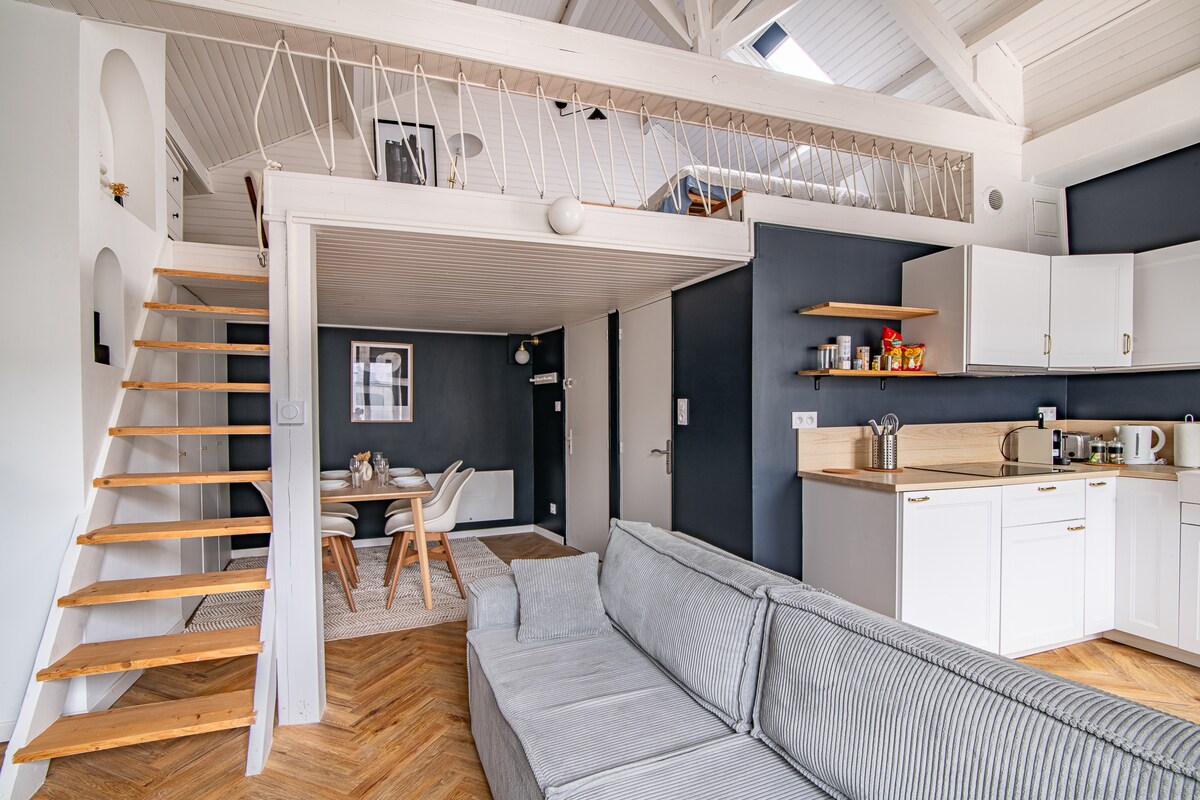 Velkommen til det sjarmerende loftsleiligheten vår på 70 m², ideelt plassert i sentrum av Cholet. Perfekt for en romantisk ferie, har overnattingen vår en varm atmosfære og toppmoderne fasiliteter. Bare 25 minutter fra den berømte Puy du Fou-parken, er det den ideelle basen for å oppdage regionen mens du nyter en avslappende og intim setting.
