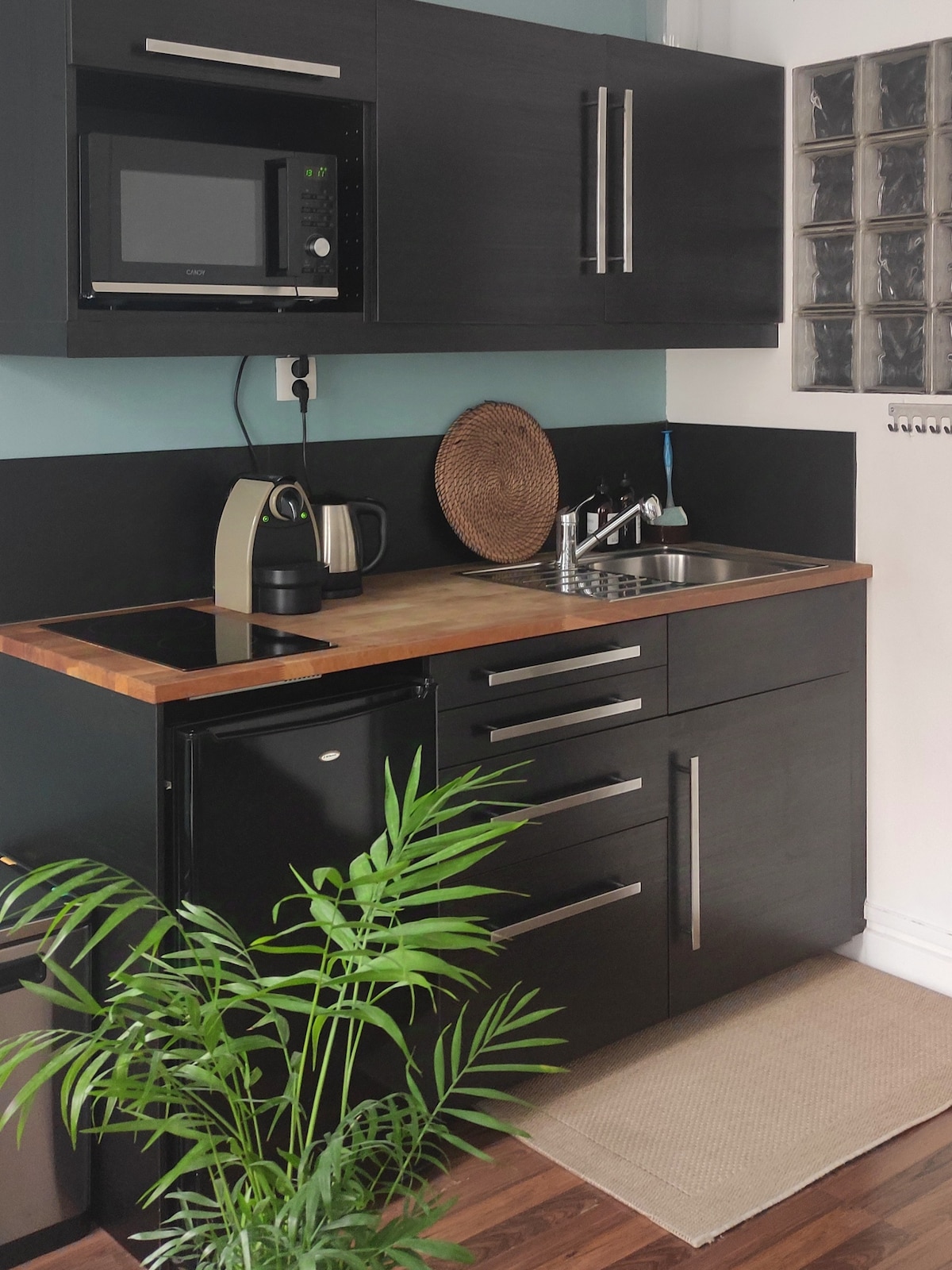 Denne leiligheten er innredet av en arkitekt og har et åpent kjøkken – Et soverom med dobbeltseng (hotellmadrass) og en sovesofa (hotellmadrass) i stuen - vaskemaskin - oppvaskmaskin – 4K-TV i stuen og på soverommet – Dusj i italiensk stil som åpner mot soverommet – mikrobølgeovn, kjøleskap, fryser kaffemaskin, brødrister.. (soverom og stue adskilt av en korridor)