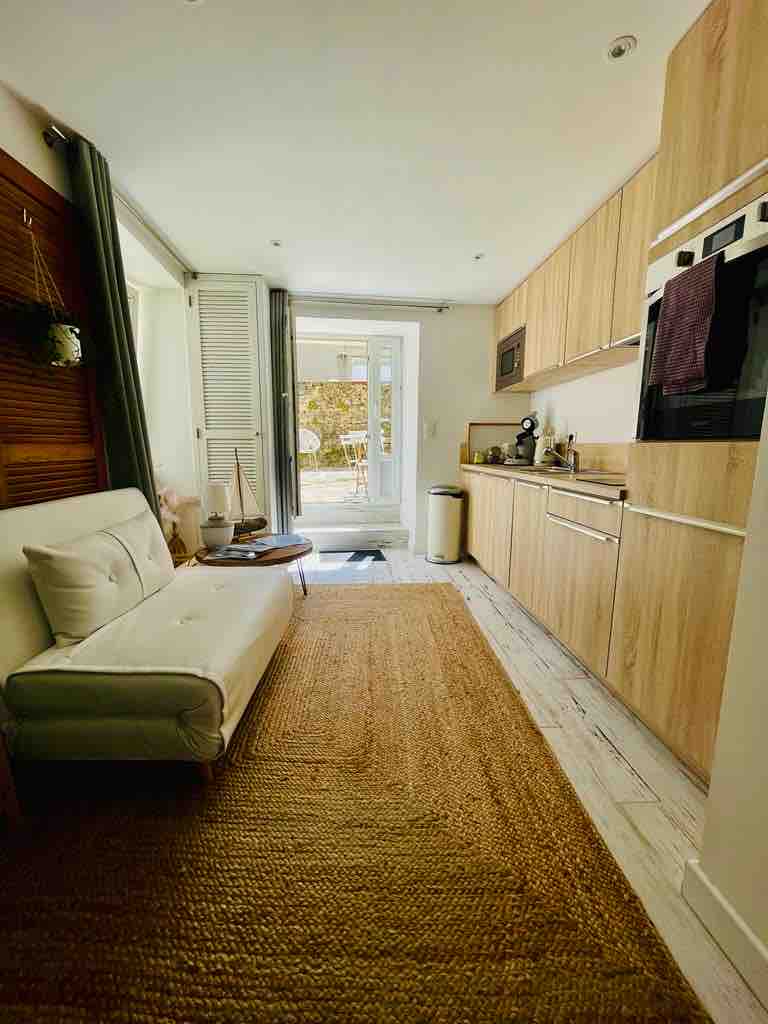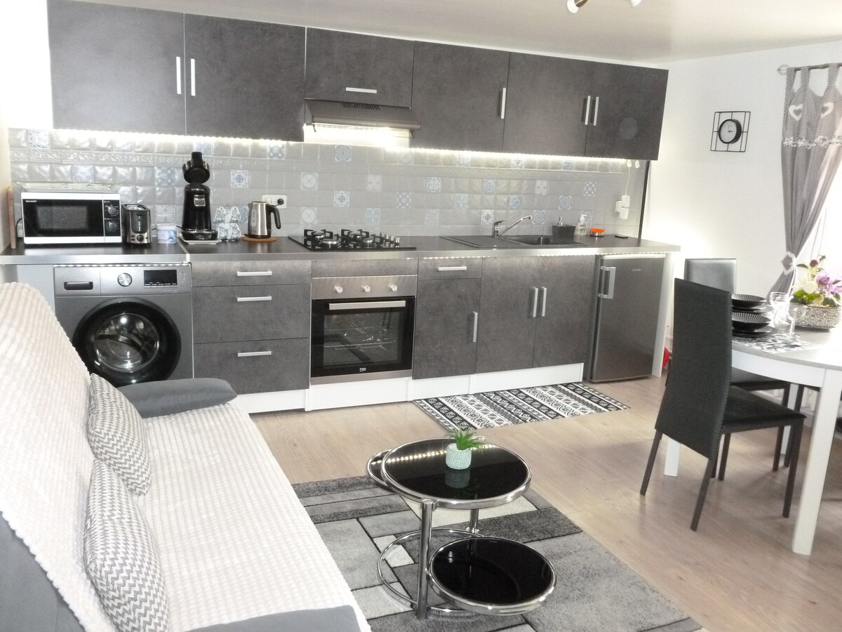 Uavhengig bolig i første etasje med egen inngang, i en paviljong som ligger i sentrum av byen, i sentrum av Manche med butikker i nærheten. 28 m² bolig med 2 rom adskilt av en skillevegg -1 stue med fullt utstyrt kjøkken (elektrisk ovn, kokeplate, mikrobølgeovn, kjøleskap, vaskemaskin) spisestue / stue (sovesofa, TV) - 1 soveplass med dobbeltseng (sengetøy følger med) - bad (dusj / vask / toalett) med dør (håndklær følger med
