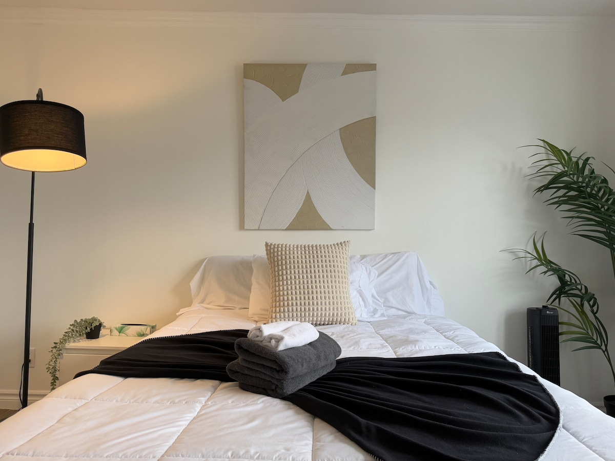 Studio med to soverom i underetasjen i et familiehus, som ligger i et rolig nabolag. Noen få minutter fra Shawinigan sentrum, 2 minutter fra motorvei 55 og Place Biermans, 10 minutter fra Vallée du Parc-stasjonen og 20 minutter fra Mauricie nasjonalpark To gratis parkeringsplasser. Romslig bakre terrasse og felles gårdsplass 2 queen size-senger Privat bad med dusj 42-tommers TV med kabel- og Netflix-tilgang, Dysney+ Wi-Fi