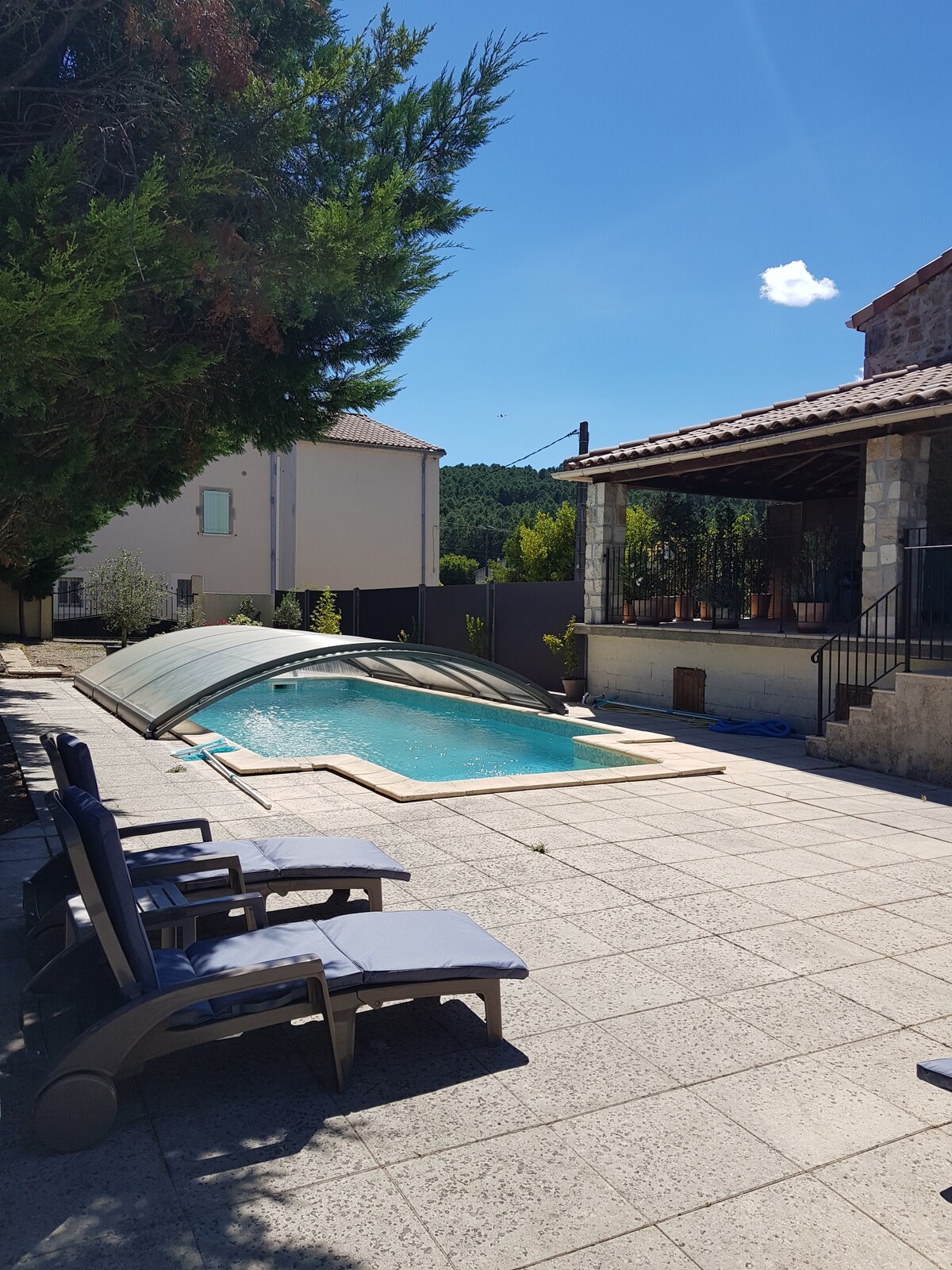 Din koselige ferie venter i Saint Andre de Cruzieres i denne luksusleiligheten. Dette nydelige stedet har ett soverom med en luksuriøs kingsize-seng, et moderne bad med italiensk dusj, fullt utstyrt kjøkken og grunnleggende fasiliteter som klimaanlegg og oppvarming, badekåper, en vaskemaskin og en spiseplass. Du kan vandre rundt i en hektar hage, spredt med paraplyfeller, sypresser og oliventrær. Du kan flyte i bassenget (12 x 6) eller finpusse på selvbetjeningsbaren i bassenghuset.