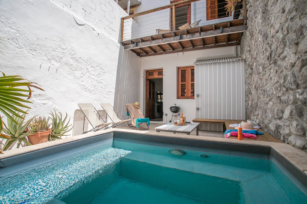 Nyt et stilig og sentralt hjem i hjertet av byen Saint-Pierre. Strand, marked, butikker, restauranter og severdigheter (museum, ruiner) ligger innenfor gangavstand. En balkong på gaten med utsikt mot Mount Pelee og katedralen. En terrasse på gårdsplassen med (liten) havutsikt. Ligger i første etasje i en bygning som ble totalrenovert i 2024, og har et areal på 60 kvm. Gratis parkering 30 meter unna.