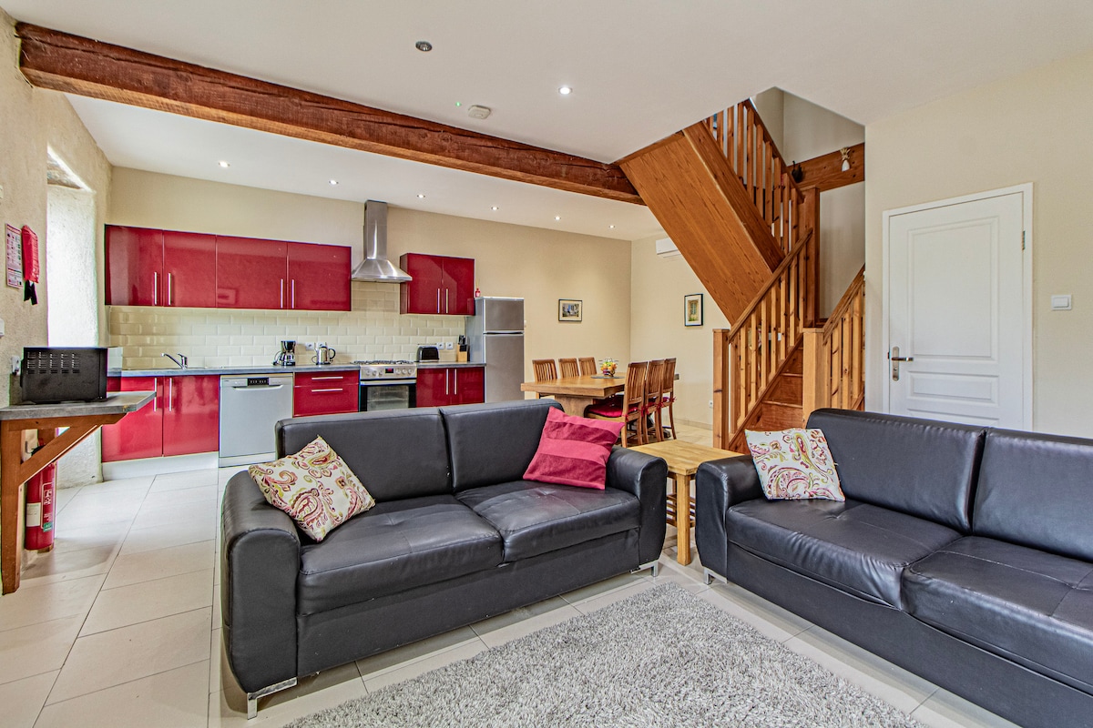 Lyst og uavhengig hus 5 minutter med bil fra alle fasiliteter med jaccuzi: nordisk bad For å oppsummere, har huset En stor stue, fullt utstyrt kjøkken Et like stort soverom med kontorplass (wifi) Et lyst og funksjonelt bad (ekstra flat dusj, hengende toalett, vaskemøbel med vaskemaskin) Terrasse, privat hage, privat parkering, grill Babyutstyr på forespørsel (barneseng, barnestol)