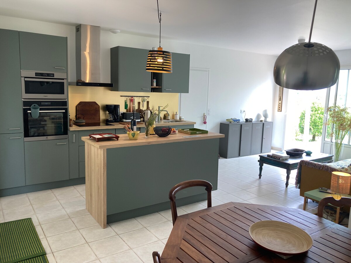 Leilighet duplex for 4 personer 55 m2, i en fin rolig bolig, parkering for bil/sykler. 150 m fra sjøen, 500 m fra Plage du Soleil, 5 minutter med sykkel fra landsbyen, butikker, 10 minutter med sykkel fra Plage de Gatseau, 20 minutter fra Grande Plage ... Sykkelstier for å besøke øya. Inngang, åpent kjøkken (kjøleskap, mikrobølgeovn, ovn, kokeplate, vaskemaskin, kaffetrakter) oppholdsrom på skyggelagt terrasse. Mezzanin 20m2 med TV-krok, kontor, soveplass med dobbeltseng. Soverom med dobbeltseng. Bad/separat toalett. Internett Wifi/fiber.