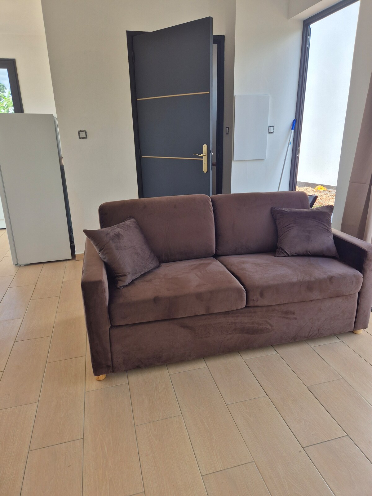 Stor T2 veldig godt utstyrt Du vil ha et romslig soverom med dobbeltseng, tilstøtende et bad med dusj. På kjøkkensiden vil du ha alt du trenger for å tilberede de rettene du ønsker. Internett / kontorhjørne Parkeringsmuligheter i en lukket gårdsplass. Tilgang til terrasse og hage. Vaskemaskin