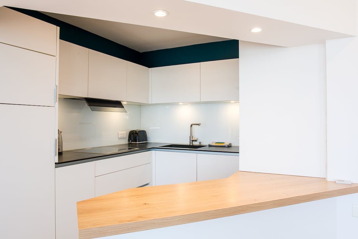 Denne romslige og moderne leiligheten har et godt lysinnfall takket være den sørlig terrassen, og tilbyr dermed et fredelig tilfluktssted. Den privilegert beliggenheten gjør den til et ideelt utgangspunkt for å utforske Bigouden og Cornouaille, eller bare for å nyte de idylliske strendene i regionen. På bare noen få minutter kan du nå den pittoreske havnen i Sainte-Marine, gå gjennom dagligvarebutikkene eller smake på spesialitetene våre i restaurantene.