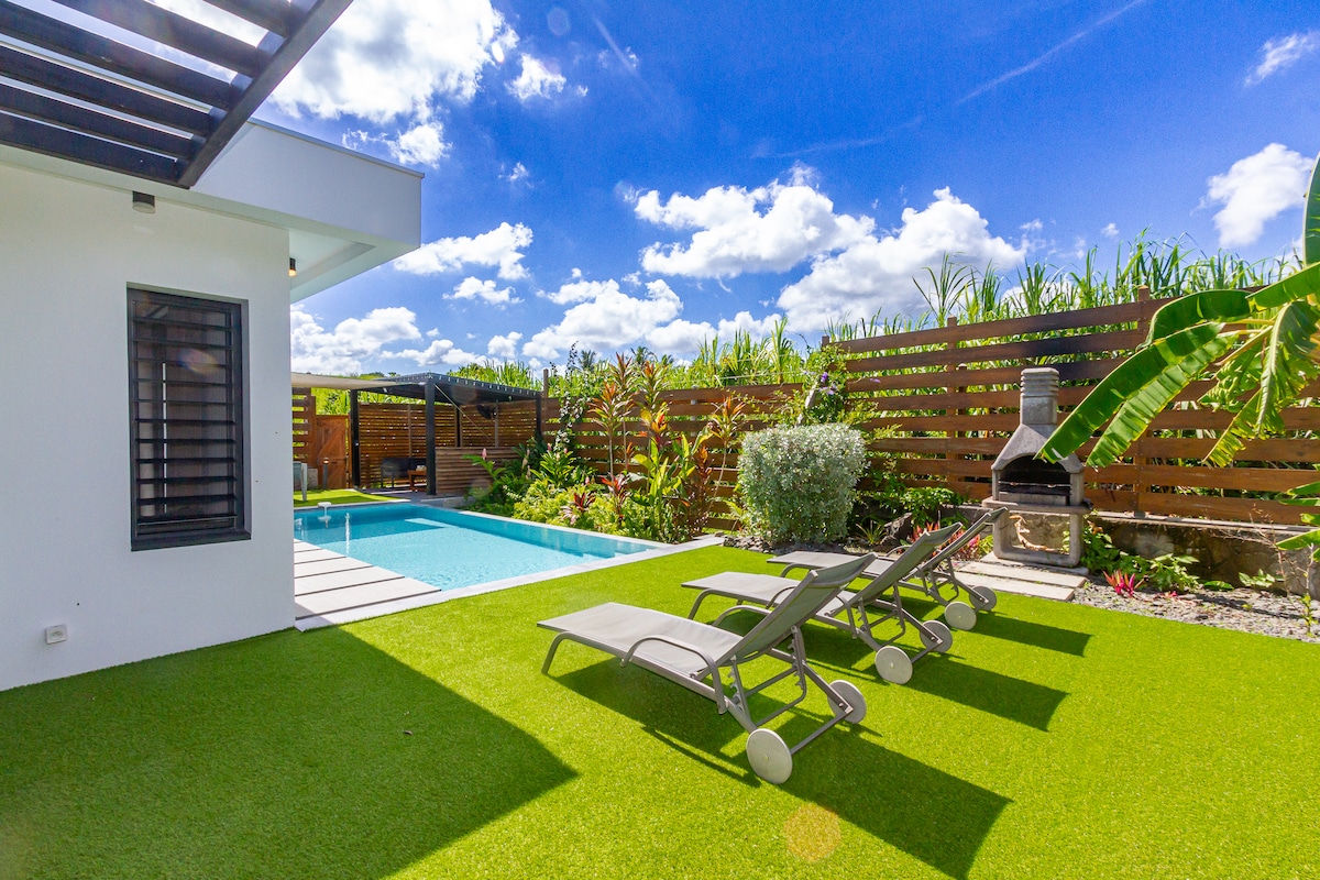 Dans quartier résidentiel très calme le WAYAKOYA, petit bungalow aux couleurs locales de 40m2 pour 2 adultes + 2 couchages en mezzanine ( surtout pour enfants)+ lit et chaise bébé 1 chambre climatisée lit de 160 1 salle d'eau+ wc 1 cuisine+ salon en terrasse 1 piscine privée 1 entrée privative wifi lave-linge & vaisselle four, micro onde frigo congélateur draps linge toilette & plage fournis Port commerces plage à 5 mn A l'arrivée apéro, repas et petit déjeuner offerts