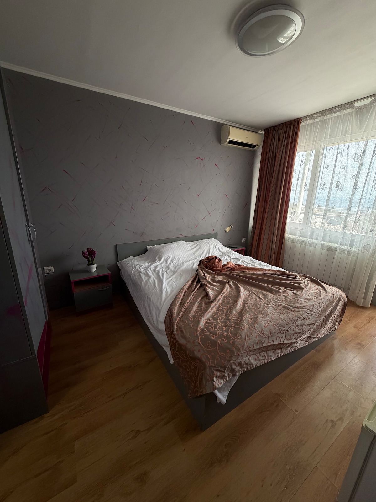 Koselig studioleilighet meter fra stranden «Golden Sands» Romslig og koselig studio for to personer med mulighet for et tre år gammelt barn i et dobbelt soverom og en lenestol, samt et privat bad og toalett. I nærheten ligger det sjømatrestauranter, bussholdeplasser, Aquapark, turstier, og det ligger bare tre–fire minutters spasertur fra stranden til Golden Sands feriested, Varna. Slapp av i studioet vårt «Golden Lemon» og føl stemningen i favorittsesongen vår – sommeren.