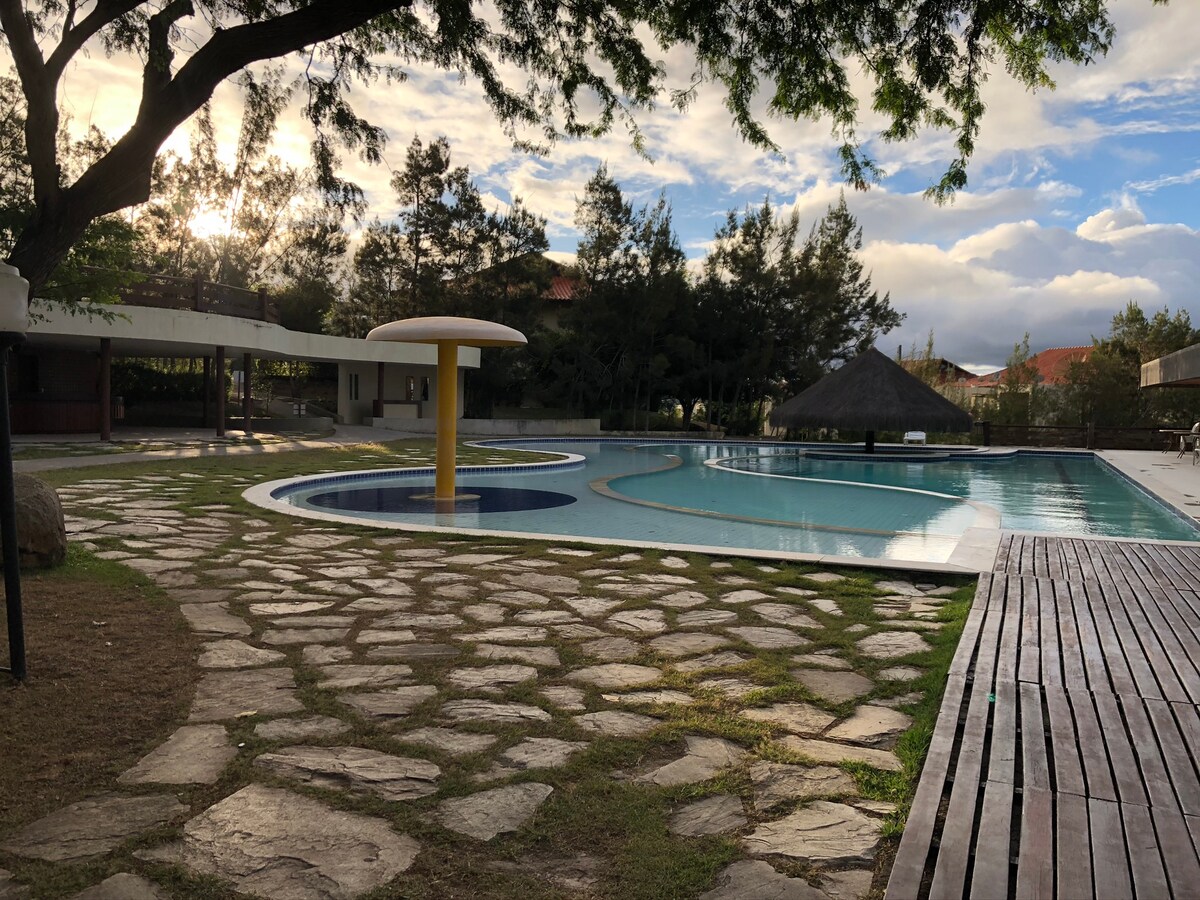 Det ser ikke engang ut som en flat! Med 72m2, romslig, godt dekorert og full av positiv energi. Ligger i Hotel Fazenda Monte Castelo, med fri tilgang til fritidsområder (svømmebassenger, barneområde, idrettsbaner, park, liten gård). Perfekt for babyer og barn i alle aldre. Du kan besøke nærliggende byer som Gravatá, Bezerros og Bonito. Gå turer, sov i hengekøya, samle familien, drikk vin, ri og til og med jobbe hjemmefra, og nyt den kjølige luften i fjellene. Hushjelp.