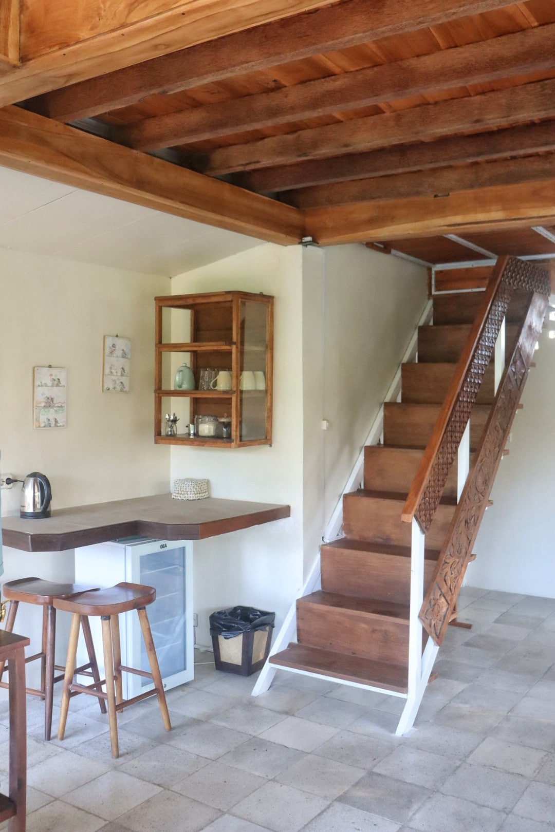 This 2-storey house with a cozy open kitchen overlooks lush rice fields and sits by a small river under big trees – perfect for relaxing in tropical nature. Although in the countryside, it´s only 20 min away from Jogja´s city center. We are a German-Indonesian family living nearby who has loved this area for years. The chill breeze in the fields and the soothing sounds of nature invite you to unwind and forget about everyday life. A healthy, homemade breakfast is included in the room price.