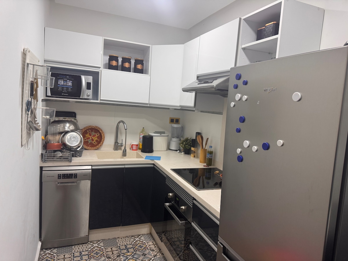 Velkommen til ditt moderne to-roms-tilfluktssted i Salé – noen minutter fra Rabat. Gåavstand til tog, trikk og butikker, med rask tilgang til Rabat og flyplassen. Varmt, lyst interiør skaper et ekte hjem borte fra hjemmet. Nyt to koselige soverom, en lys stue med 43-tommers smart-TV, Netflix og trådløst nettverk med fiber, pluss et fullt utstyrt kjøkken. Klimaanlegg på forespørsel. Innsjekking på egen hånd via smartlås i en rolig og trygg bolig – perfekt for par, familier eller venner. Gjennomtenkte detaljer for et stressfritt opphold – ekstra komfort og privatliv.