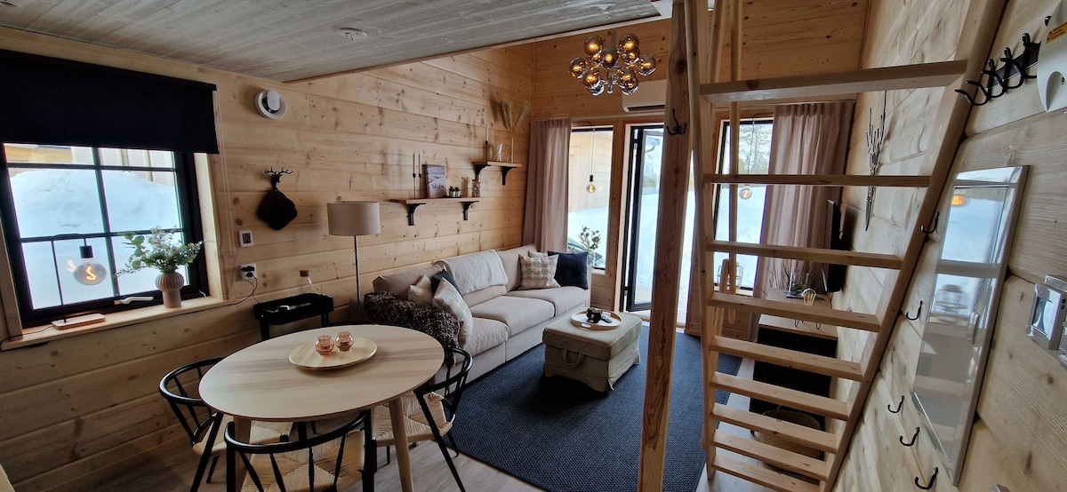 Welcome to our charming cabin with a cozy sauna and grill room in the backyard. The cabin is divided into two separate parts rented out separately. There's a free ski bus nearby and access to beautiful cross-country and snow scooter tracks just by the house. The slopes, supermarkets etc. are just a 5-minute drive. Local restaurants within a 15-minute walk. Please note that cleaning is only included during Christmas, New Year, W6,W7,W8, W9. Cleaning and bed linnen can be requested anytime.