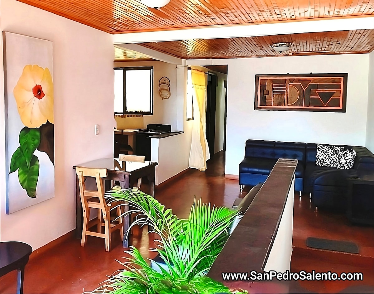 Privat parkering inkludert! Perfekt beliggenhet – bare noen kvartaler fra Salentos hovedplads og historiske gater. Denne koselige hytta med to soverom har alt du trenger for et fredelig opphold. Den ligger i en vakker historisk hacienda og har en utendørs terrasse omgitt av hager, trær og fugler. Nyt avokado-, lime- og guavatrær, pluss en majestetisk voks-palme på eiendommen. Nær kaféer, restauranter og byens beste attraksjoner.