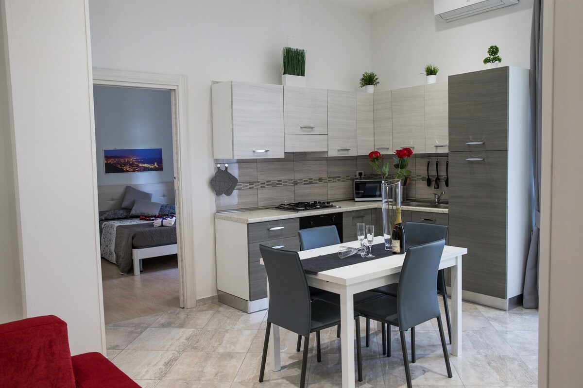 En komfortabel studioleilighet på 22 kvadratmeter, med klimaanlegg for både varmt og kaldt vær, og med et lite tekjøkken i et eget område utstyrt med induksjonskomfyr og kjøleskap. Leiligheten har raskt trådløst nettverk og også en LAN-kabelforbindelse. Den ligger i hjertet av byen, bare 100 meter fra sideinngangen til hovedtogstasjonen og noen minutter fra fergeterminalen for Amalfikysten og bussholdeplassen for Napoli, Pompeii, Amalfi og Positano.