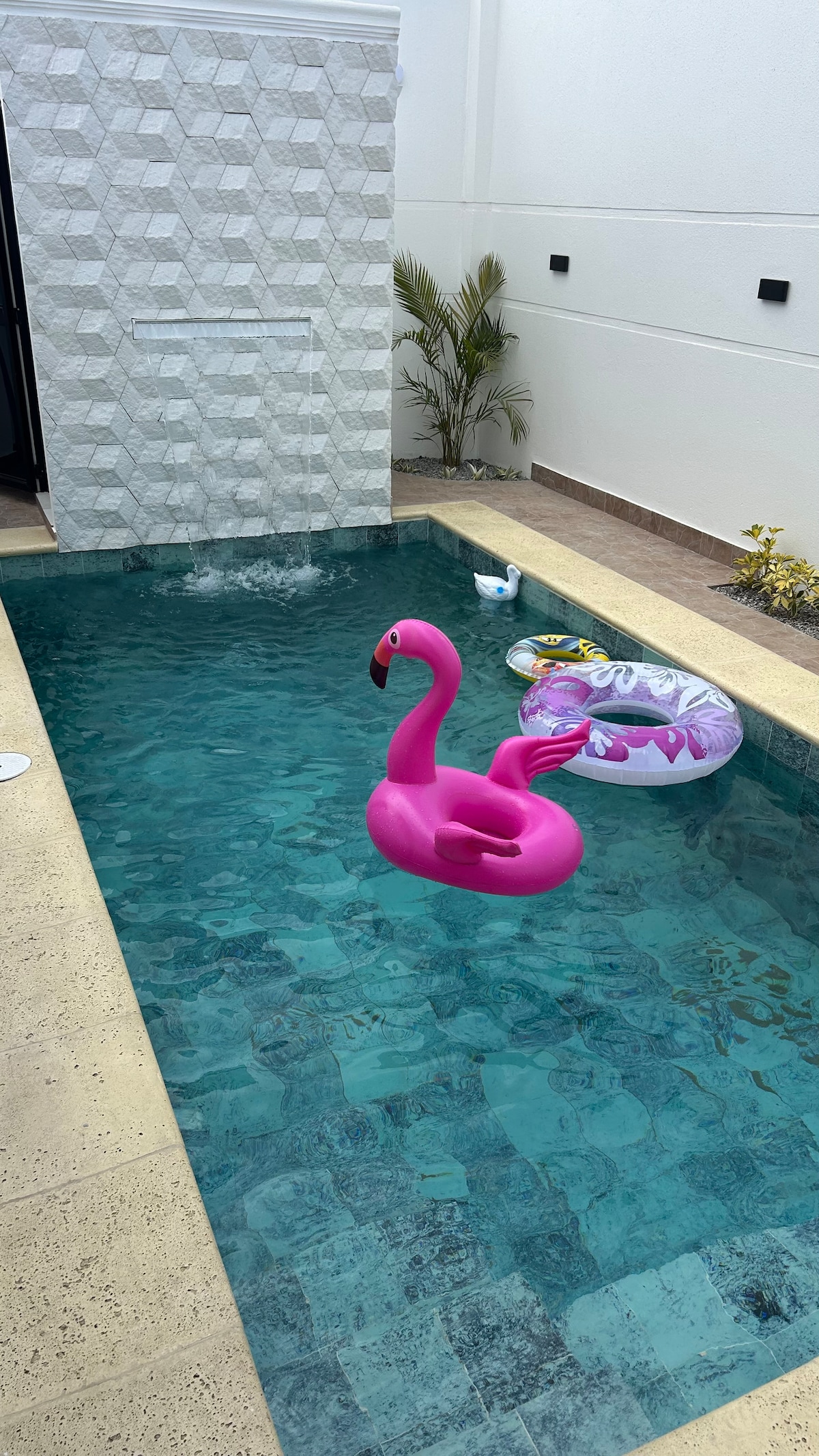 Slapp av sammen med hele familien på dette fredelige og private tilfluktsstedet. Dette fantastiske huset ligger i et eksklusivt boligkompleks med fire boliger, og har tre romslige soverom og tre bad, noe som gir rikelig plass og privatliv for alle. Slapp av ved det store bassenget, fyr opp grillen eller bare nyt de innbydende fellesområdene designet for avslapping og samvær. Hvert soverom er utstyrt med AC Split-enheter for din komfort, og hjemmet inkluderer høyhastighets trådløst nettverk og smart-TV-er for underholdning.