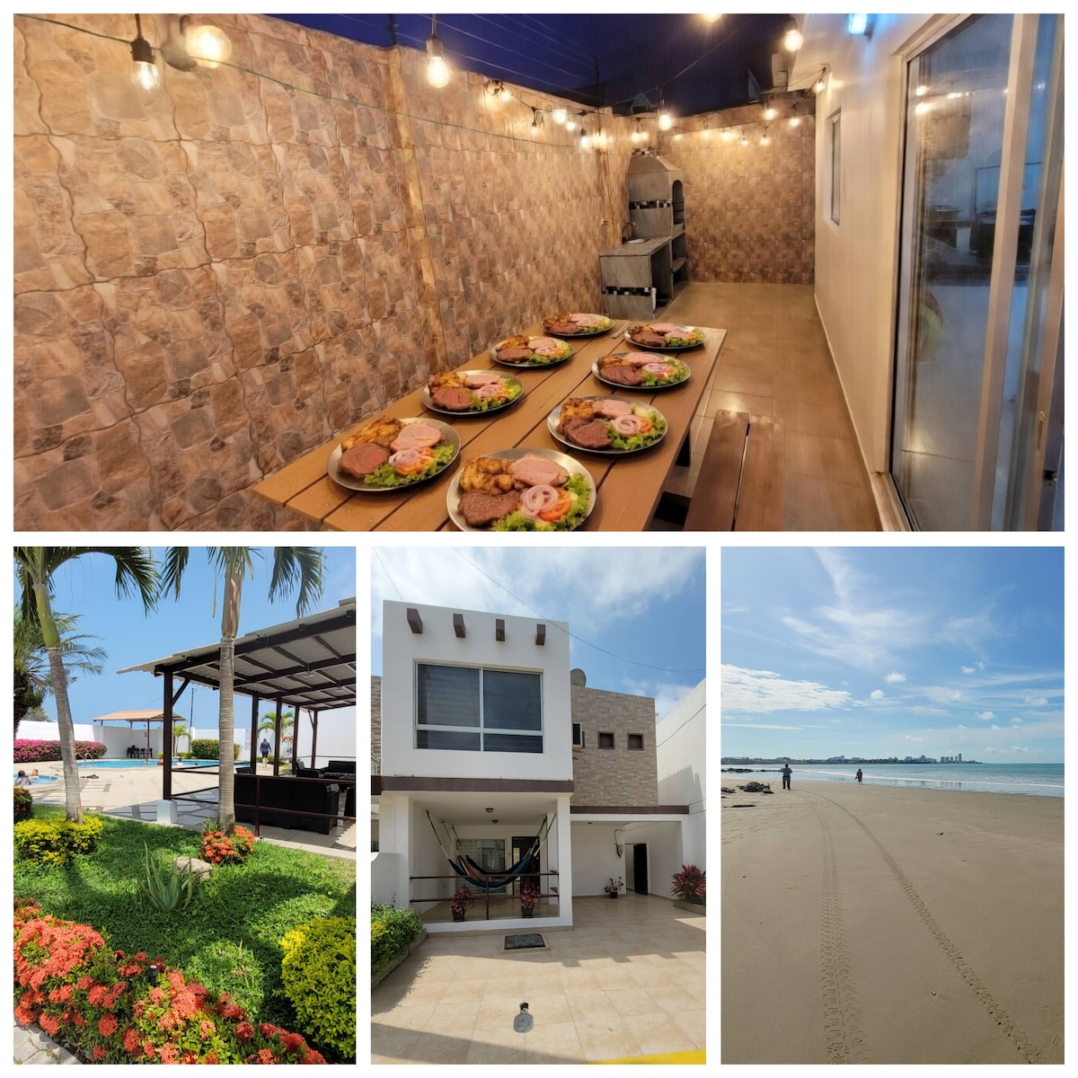 Komfortabelt treetasjes hus med direkte tilgang til stranden og panoramautsikt over havet. Perfekt for familier eller grupper, og tilbyr: 🛏️ 5 soverom med A/C. | Soverom 4 og 5 er forbundet med en skyvedør og deler et hovedklimaanlegg. Barneseng tilgjengelig for babyen din. Fullt utstyrt🍽️ kjøkken | 5 komplette bad | 🛋️ Flere stuer ⛱️ Strandtelt inkludert. Grillplass og privat basseng. 🚫IKKE kjæledyrvennlig Maksimal 👥 kapasitet: 10 personer (inkludert barn).
