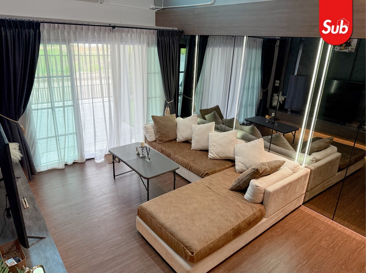 Standard med tre soverom | Fire bad | Én stue | Ett bønnerom | Parkeringsplass for 3–4 biler Hvis du bestiller for 13 gjester eller flere, klargjør vi det fjerde soverommet spesielt. 🏠 Romslig hjem i sentrum og 🌙 muslimvennlig. 📍 Tre minutters kjøretur til Central Festival og ASEAN Night Bazaar. 📍3 minutters gange til 7-Eleven, Mini Big C og lokale matboder 📍7 minutters kjøretur til Lee Garden, Makro Tuk Tuk passerer.