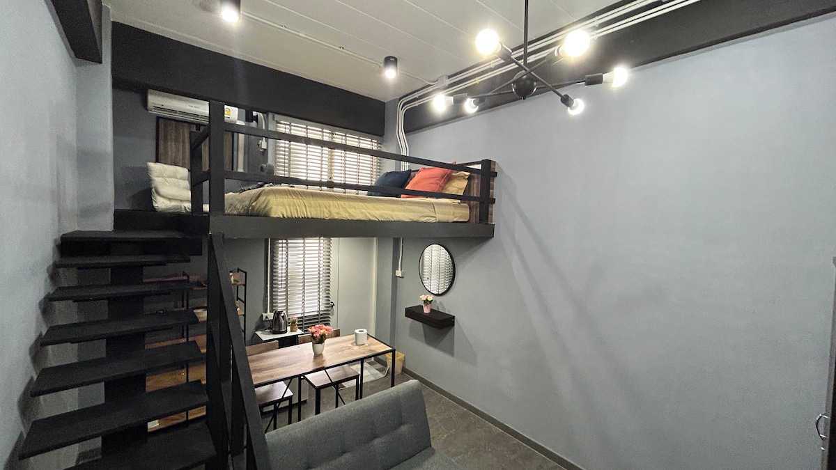 Dette loftet og designet tilbyr en unik og ekstraordinær opplevelse i Bangkok. Kombinasjonen av metall og tre i det elegante designet gjør dette spesielle loftet virkelig ekstraordinært og sjarmerende. Den praktiske beliggenheten i nærheten av to MRT-stasjoner og tilgjengeligheten av bekvemmeligheter og fasiliteter, sammen med vårt imøtekommende personale, gjør loftsenheten din til et enda mer attraktivt alternativ. La oss være ditt perfekte andre hjem for turen din i Thailand.