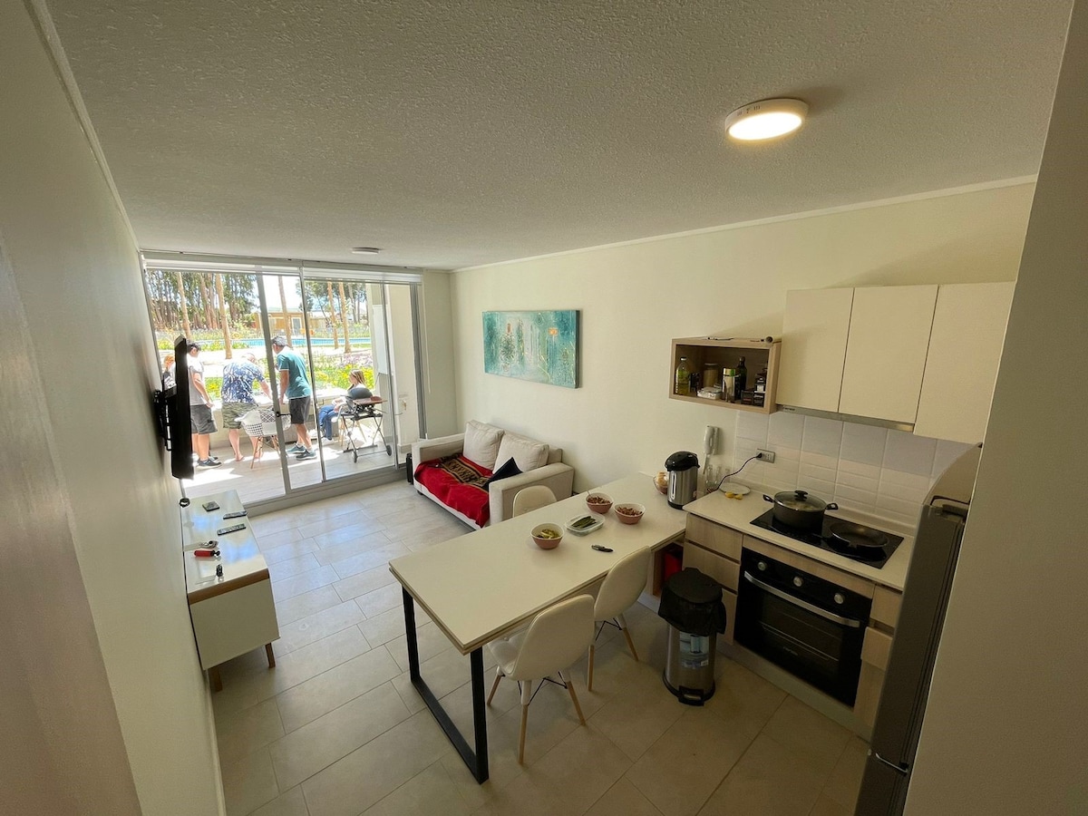 Fantastisk ny leilighet for 6 personer som ligger i den nordlige delen av Algarrobo, fullt utstyrt og komfortable områder. Den har direkte tilgang til svømmebassenger og grillplasser i fellesområder, turstier, tennisbaner, babyfotball, svømmebasseng og klubbhus. Det er et rolig og trygt sted, omgitt av natur, ideelt for en velfortjent familieferie. Den har en privilegert beliggenhet fordi den ligger i nærheten av stranden (500 meter) og gastronomisk variasjon. Vi venter på deg!
