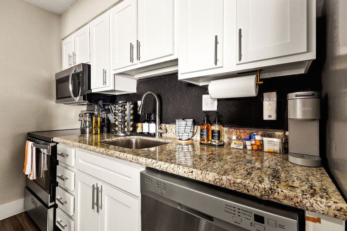 Bo, jobb og lek i San Antonio sentrum i denne stilige studioleiligheten i det ettertraktede Edge Studios-samfunnet! Enten du er her for å jobbe, ha det gøy eller litt av begge deler, kommer du til å elske det rene, moderne designet og de gjennomtenkte fasilitetene som får dette stedet til å føles som hjemme. Dette kommer du til å elske: Basseng, treningsrom og terrasse for avslapning. Lys, åpen planløsning med en komfortabel kingsize-seng og koselig stue. Fullt utstyrt kjøkken – perfekt for hjemmelagde måltider. Raskt trådløst nettverk og en smart-TV for arbeid og underholdning.