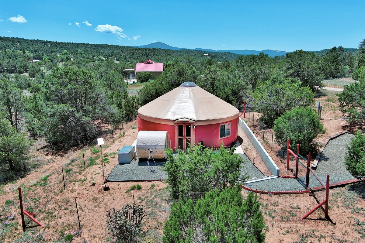 *LES ALL eiendomsinformasjon FØR DU BESTILLER* Bo på det kuleste stedet i Santa Fe-området. Ny terrasse! Glampingkuppel på 8 private hektar gamle daler, like sør for Santa Fe på Hwy 14. Nyt 360 graders utsikt over alle fjellkjeder i området - Sangre de Christos, Jemez, Sandias, Ortiz, Manzanos. Du får til og med Taylor, silhuetten av utsøkte solnedganger. Dette er den ultimate glampingopplevelsen med høy ørken. Innendørs rørleggerarbeid, varme, steindusj, kingsize-dobbeltseng. Personlig kokketjeneste tilgjengelig.