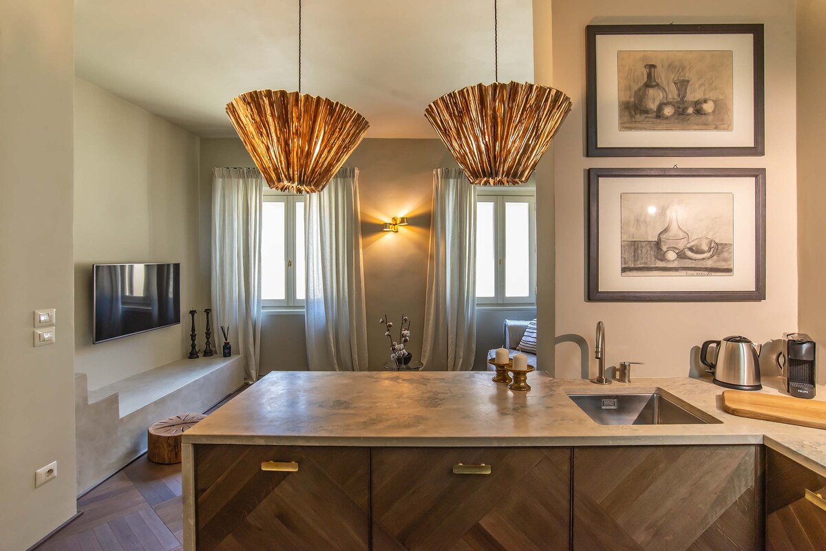 Bla gjennom tradisjonelle håndverksbutikker, og trekk deg tilbake til den moderne, stilige etno-chic leiligheten for å friske seg opp i den industrielle, elegante dusjen. Etterpå kan du slappe av med en avslappet aperitivo på en av de to terrassene i denne solfylte oasen, som ligger i en historisk florentinsk bygning med utsikt over den storslåtte Boboli-hagen. Den elegante bygningen er designet rundt fredelige indre gårdsplasser, og tilbyr en rolig flukt fra gaten og folkemengdene.