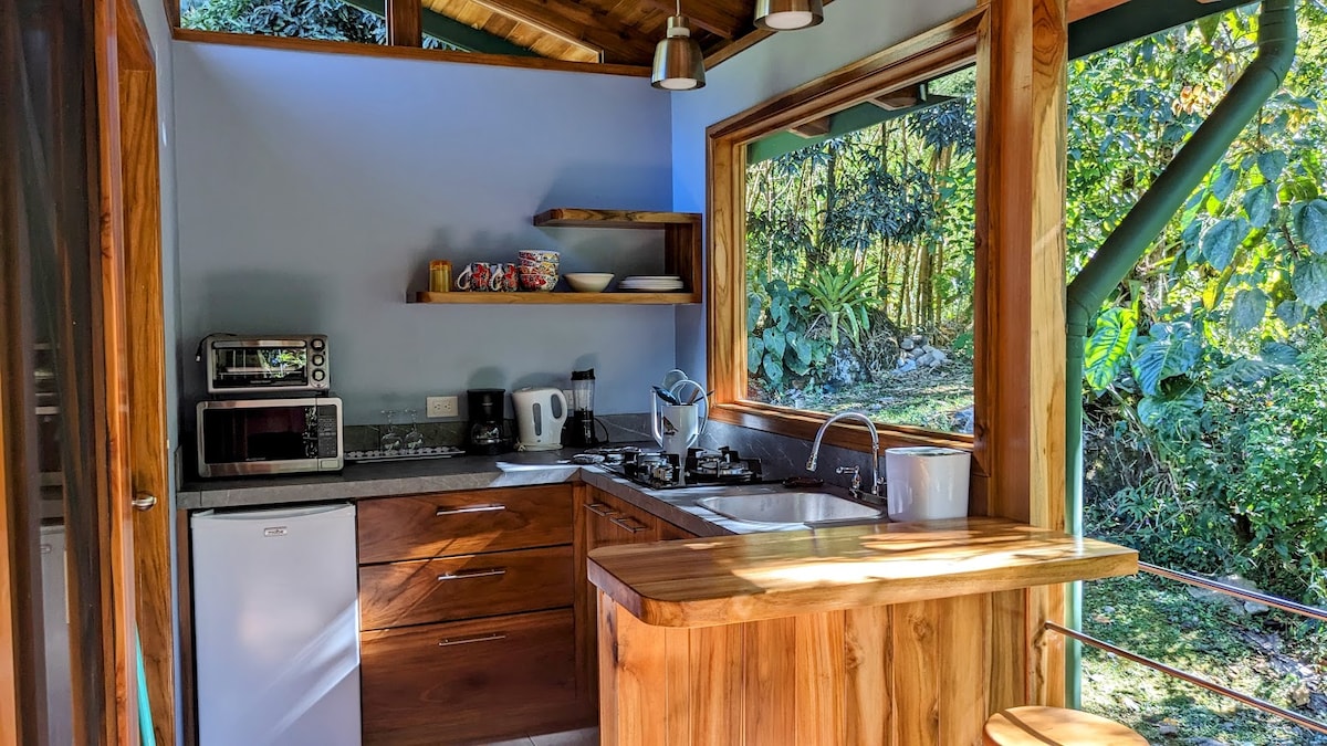 Denne magiske eiendommen ved elven ligger i de frodige åsene i Chirripó, akkurat der to elver møtes. Stedet ligger på en eiendom på nesten en hektar og inviterer deg til å vandre fritt – utforske naturstier, oppdage små naturlige dammer og slappe av på fredelige steder langs elvebredden. Denne casitaen er et koselig, privat og kjærlig utformet sted med sengetøy og tepper i ren bomull for maksimal komfort. Den er utformet slik at du enkelt kan sove, lage mat og jobbe, noe som gjør den perfekt for både kortvarige og lengre opphold.
