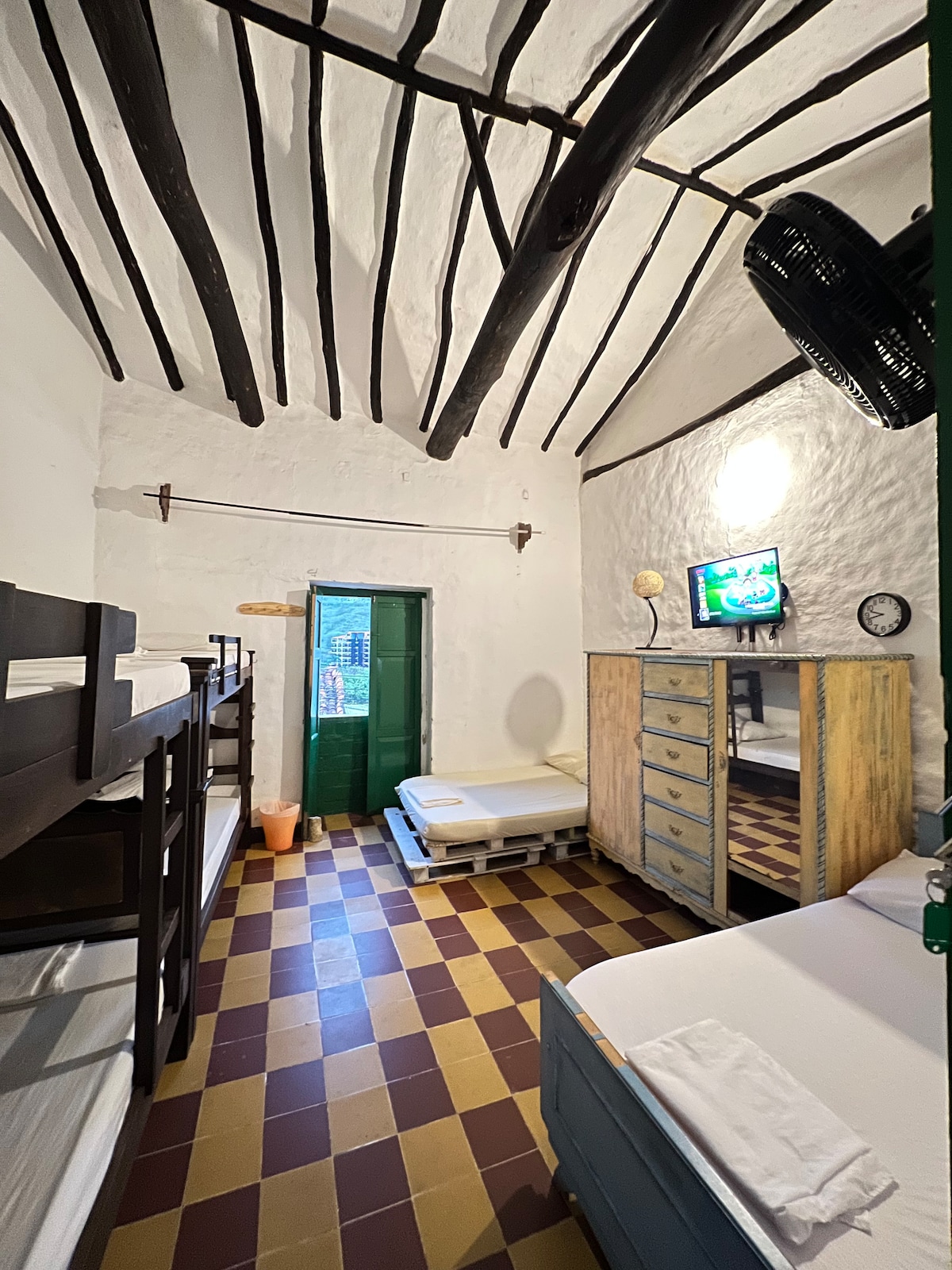 Es un hostal contamos con una habitación con familiar con baño privado que cuenta con una cama doble una litera doble y dos literas sencillas es decir, que tiene capacidad de máximo diez personas.Además cuenta con ventilador y acceso a zonas comunes como son la piscina, el jardín y la zona de hamacas.