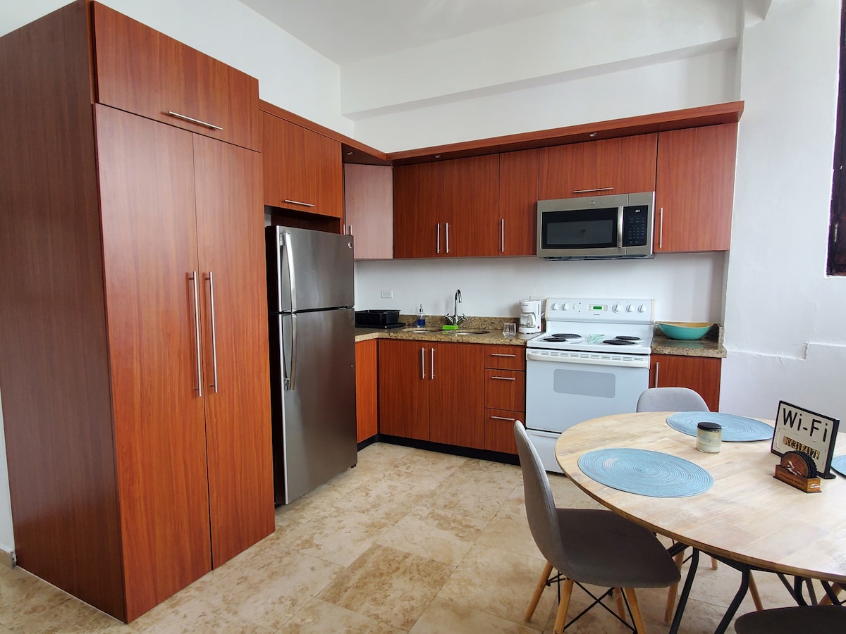 Beliggenhet Leiligheten ligger i Puerto Ricos politiske og kulturelle hovedstad San Juan. Det ligger innenfor gangavstand fra de beste stedene Old San Juan har å tilby. Fantastiske barer og restauranter, hoteller, kasinoer, San Critobal Castle, Paseo La Princesa , torg og cruiseterminalen ligger bare få skritt unna. I sine omgivelser er det også gårder, transporttjenester, et postkontor, butikker for shopping,strender og katedraler. Leiligheten ligger 10 minutters kjøring til Konferansesenteret og 20 minutter til den internasjonale flyplassen. Plasser Typisk for spansk kolonial arkitektur inkluderer leilighetsrommene en innendørs balkong, perfekt for avkobling, og høye tak, opptil 20 fot høye, sportslige tradisjonelle Ausubo-trebjelker. Fasiliteter Fullt kjøkken med industristekeovn og stekeovn, mikrobølgeovn, kjøleskap, kaffetrakter og servise. Det koselige soverommet har en komfortabel queensize-seng, a/c og skuffer til oppbevaring. Stue med flat HDTV, Blue Ray, DVD-spiller, WI-Fi, parabolantenne. Vasketilgang i gangen.