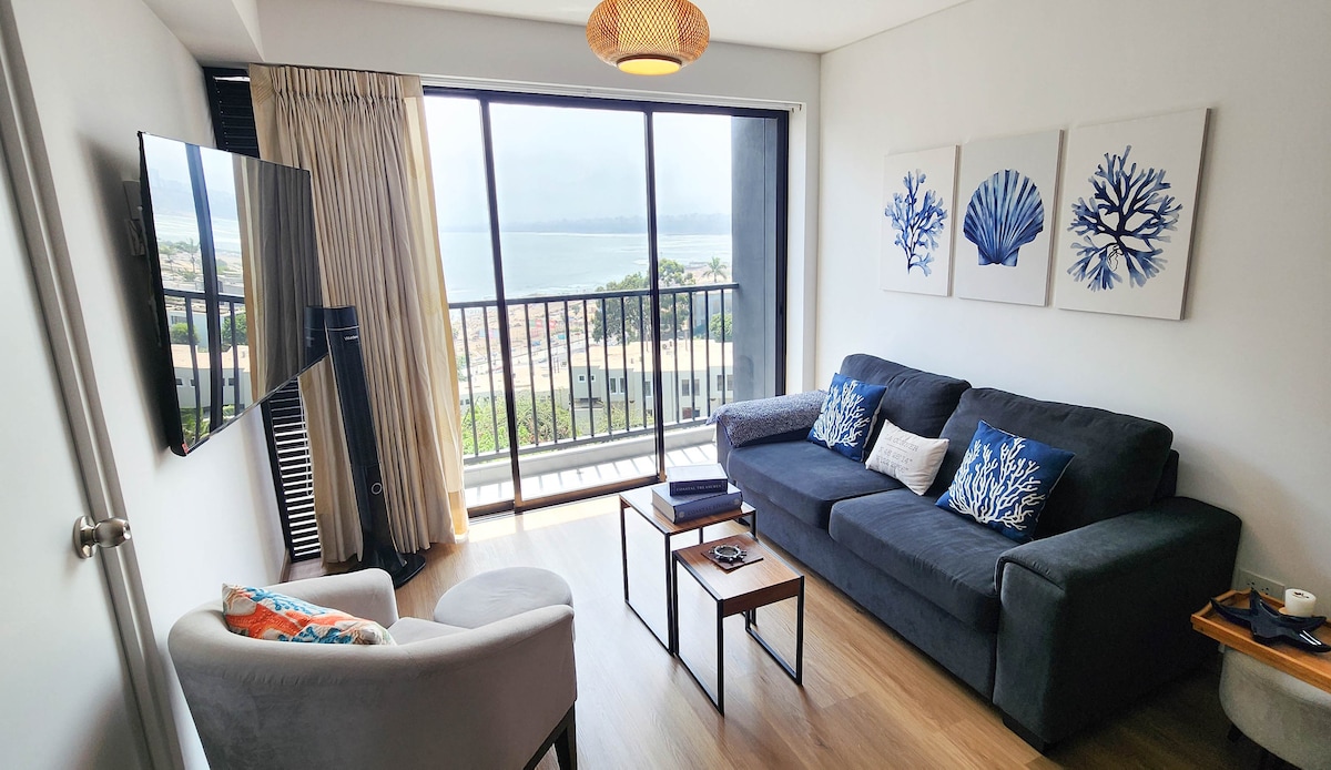 Vakkert loft med utsikt over Stillehavet foran Larcomar. Den beste beliggenheten for å utforske Miraflores og Barranco, de mest besøkte stedene og restaurantene. Spaser langs den vakreste og sikreste promenaden som forbinder tre bydeler. Det blir en glede å våkne om morgenen med utsikt over Lima-bukten, den vakre esplanaden og parken. Rett og slett spektakulært. Du kommer til å nyte å lage og drikke kaffen din mens du ser på sjøen. Å komme tilbake til det vakre loftet etter å ha vært på tur i byen er en total glede.