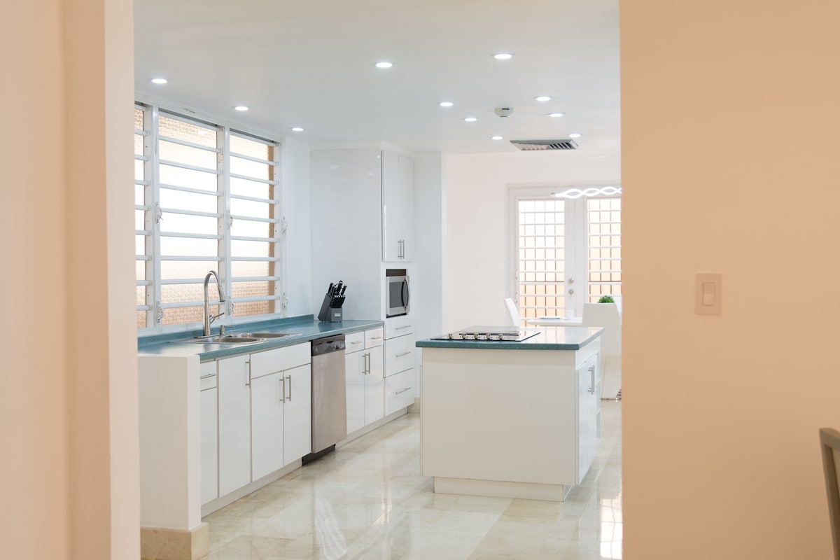 Gå inn i den luksuriøse 4BR 3Bath-leiligheten som ligger i et rolig område bare en kort spasertur (10 minutter) unna havet, solfylte strender, restauranter, butikker og spennende attraksjoner. Utforsk Isla Verde eller sol deg i den puertoricanske solen på de nærliggende strendene. Den moderne designen og den rike listen over fasiliteter vil imponere deg. ✔ Tre suiter med eget bad, pluss ett rom. ✔ Åpen designstue. ✔ Fullt utstyrt kjøkken ✔ smart-TV-er ✔ Trådløst nettverk med høy hastighet. ✔ Vaskemaskin/tørketrommel ✔ Strandtilbehør. ✔ Gratis gateparkering.