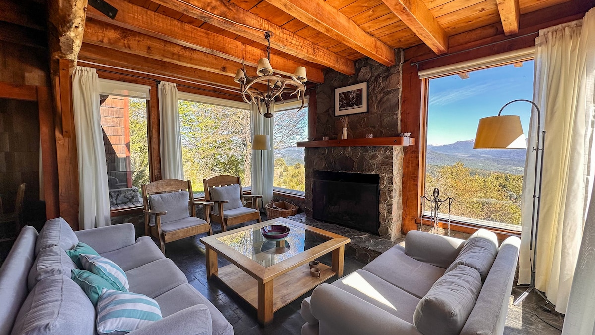 Slapp av på dette rolige og stilige stedet. Omgitt av en unik Maitenes-skog, bare fire km fra strendene ved innsjøen Lolog og ti minutter fra kjøpesenteret. Den skiller seg ut fra stiene og utsiktspunktene i omgivelsene, med unik utsikt over den andinske fjellkjeden. Fullt utstyrt, slik at du kan nyte luksus og komfort i et naturlig miljø som inviterer deg til å hvile og slappe av. La oss prøve frokosten vår. Om vinteren tilbyr vi deg transport til Esqui Chapelco sentrum.