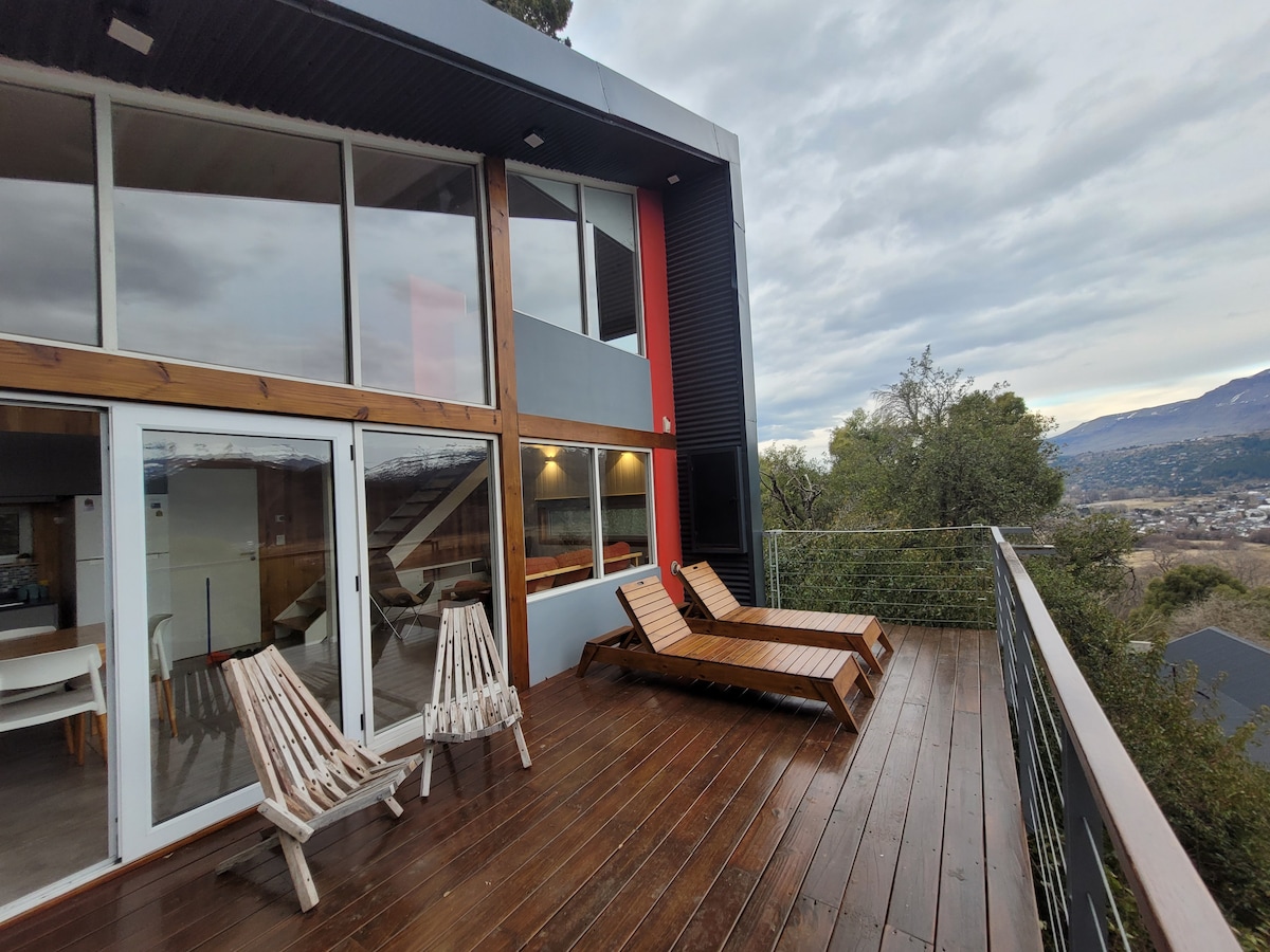 Moderne hus, romslige omgivelser, utrolig utsikt, detaljer av høy klasse, lyst. Ligger i boligområdet Altos del Sol, to kvartaler fra Lanín nasjonalpark, og ti kvartaler fra sentrum. Øverste etasje: gjestebad, stor stue, fullt utstyrt kjøkken. Vaskerom. Første etasje har fire soverom, to med dobbeltsenger, hovedsoverom med garderobe og eget bad. To andre soverom med sovesofa. Bad. Stor grillplass, boblebad og minigym.