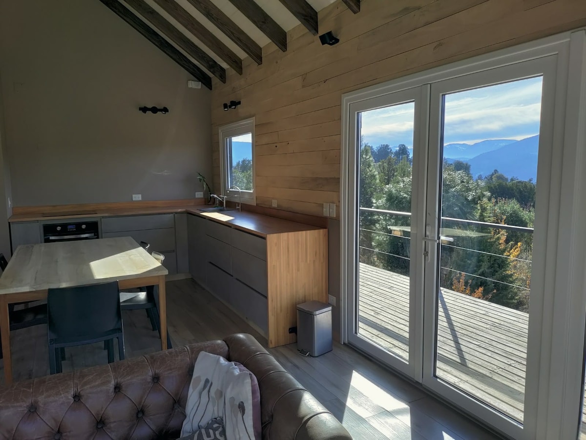 Moderne hytte som ligger 6,5 km fra sentrum av San Martín de los Andes. Fra den private parkeringsplassen er det en trapp med 15 trinn. Den har 50 m2 fordelt på to rom, en integrert stue-spisestue-kjøkken med designdetaljer og et soverom i andre etasje med balkong mot stuen. Alle rommene har utsikt over Chapelco-fjellet, omgitt av naturlig skog med spektakulær utsikt og en fantastisk terrasse som gir deg den beste utsikten og mulighet til å ta de beste bildene av San Martín og Chapelco