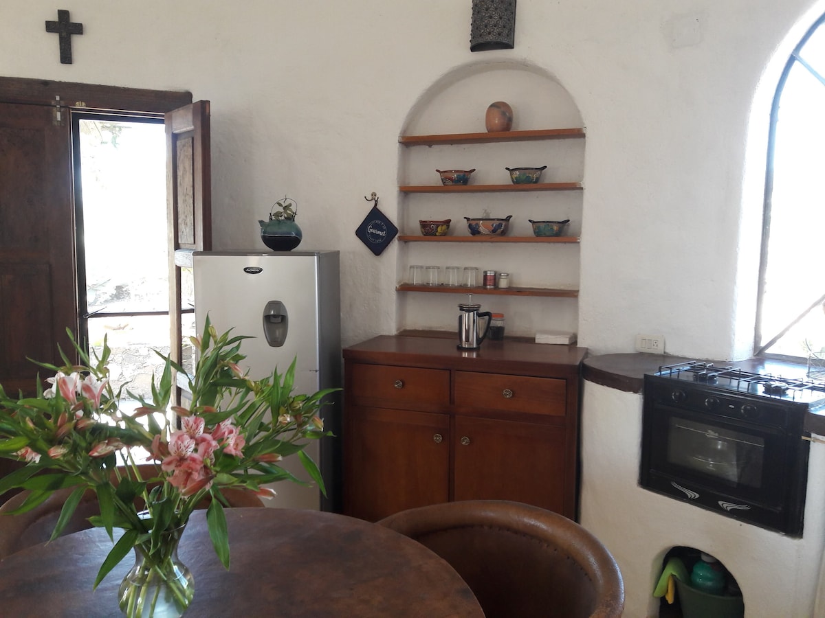 Ett soveroms adobe-hus med kjøkken, bad, stue med en sofá, chimeny og en privat terrasse. Gjesten vår kan bruke fellesområdene som en palapa, et stort kjøkken og et utendørs spisebord. På samme eiendom ligger to andre bygninger med ett soverom og eget bad. Det er god plass til å gå tur, lese eller drive med yoga.