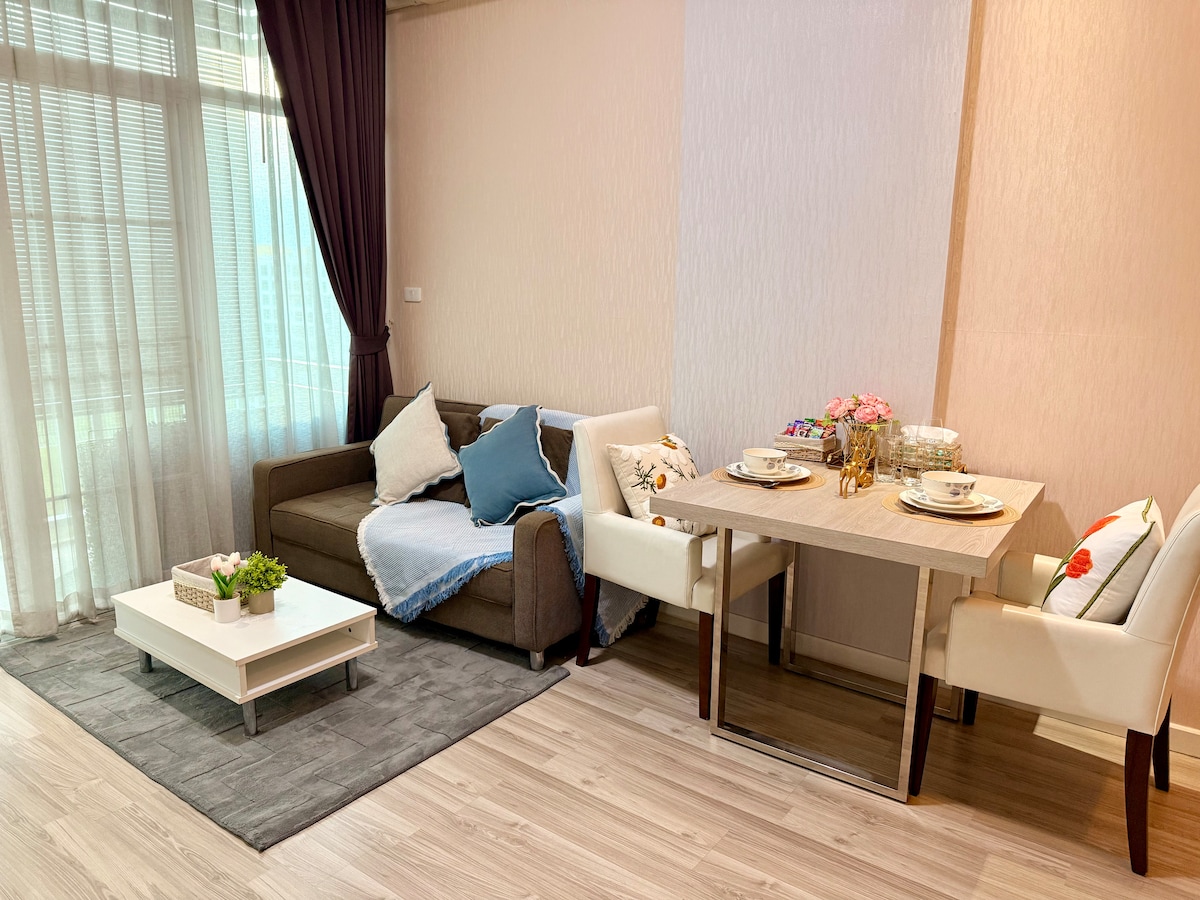 Velkommen til The One Chiangmai, vår komfortable leilighet! Denne vakkert designede to-romsleiligheten ligger i nærheten av CENTRAL FESTIVAL, med enkel tilgang til restauranter og kjøpesentre. Det er et lyst, romslig og moderne sted som tilbyr komfortabel innkvartering for alle gjester. Leiligheten ligger i et trygt og rolig nabolag med 24-timers sikkerhetstjeneste. Enten du er i byen for å reise, besøke familie eller på forretningsreise, er denne leiligheten det perfekte valget for overnatting. Vi gleder oss til å se deg.